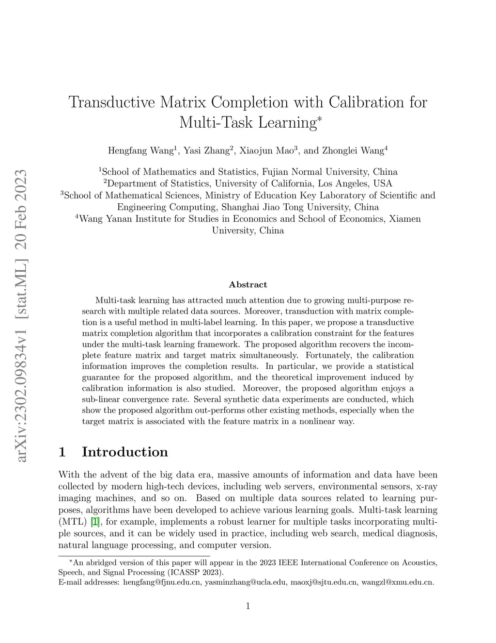 Multi-task learning has attracted much attention due to growing multi-purpose research with multiple related data sources. Moreover, transduction with matrix completion is a useful method in multi-label learning. In this paper, we propose a transductive matrix completion algorithm that incorporates a calibration constraint for the features under the multi-task learning framework. The proposed algorithm recovers the incomplete feature matrix and target matrix simultaneously. Fortunately, the calibration information improves the completion results. In particular, we provide a statistical guarantee for the proposed algorithm, and the theoretical improvement induced by calibration information is also studied. Moreover, the proposed algorithm enjoys a sub-linear convergence rate. Several synthetic data experiments are conducted, which show the proposed algorithm out-performs other existing methods, especially when the target matrix is associated with the feature matrix in a nonlinear way.