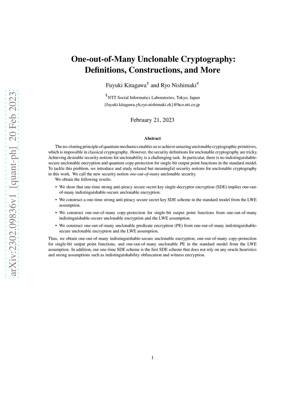 The no-cloning principle of quantum mechanics enables us to achieve amazing unclonable cryptographic primitives, which is impossible in classical cryptography. However, the security definitions for unclonable cryptography are tricky. Achieving desirable security notions for unclonability is a challenging task. In particular, there is no indistinguishable-secure unclonable encryption and quantum copy-protection for single-bit output point functions in the standard model. To tackle this problem, we introduce and study relaxed but meaningful security notions for unclonable cryptography in this work. We call the new security notion one-out-of-many unclonable security. We obtain the following results. - We show that one-time strong anti-piracy secure secret key single-decryptor encryption (SDE) implies one-out-of-many indistinguishable-secure unclonable encryption. - We construct a one-time strong anti-piracy secure secret key SDE scheme in the standard model from the LWE assumption. - We construct one-out-of-many copy-protection for single-bit output point functions from one-out-of-many indistinguishable-secure unclonable encryption and the LWE assumption. - We construct one-out-of-many unclonable predicate encryption (PE) from one-out-of-many indistinguishable-secure unclonable encryption and the LWE assumption. Thus, we obtain one-out-of-many indistinguishable-secure unclonable encryption, one-out-of-many copy-protection for single-bit output point functions, and one-out-of-many unclonable PE in the standard model from the LWE assumption. In addition, our one-time SDE scheme is the first SDE scheme that does not rely on any oracle heuristics and strong assumptions such as indistinguishability obfuscation and witness encryption.