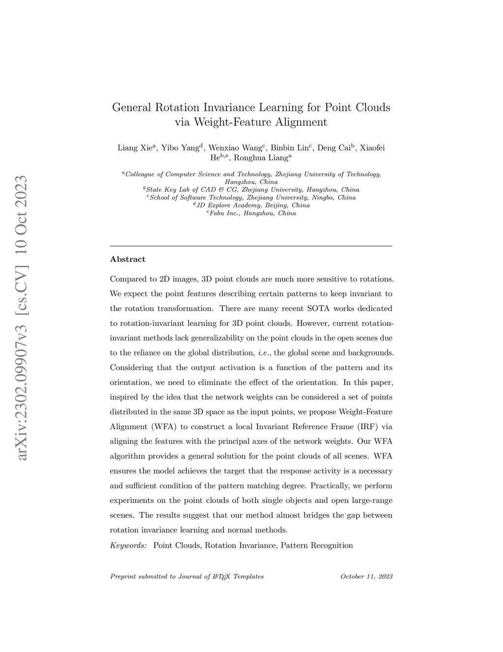 Compared to 2D images, 3D point clouds are much more sensitive to rotations. We expect the point features describing certain patterns to keep invariant to the rotation transformation. There are many recent SOTA works dedicated to rotation-invariant learning for 3D point clouds. However, current rotation-invariant methods lack generalizability on the point clouds in the open scenes due to the reliance on the global distribution, \ie the global scene and backgrounds. Considering that the output activation is a function of the pattern and its orientation, we need to eliminate the effect of the orientation.In this paper, inspired by the idea that the network weights can be considered a set of points distributed in the same 3D space as the input points, we propose Weight-Feature Alignment (WFA) to construct a local Invariant Reference Frame (IRF) via aligning the features with the principal axes of the network weights. Our WFA algorithm provides a general solution for the point clouds of all scenes. WFA ensures the model achieves the target that the response activity is a necessary and sufficient condition of the pattern matching degree. Practically, we perform experiments on the point clouds of both single objects and open large-range scenes. The results suggest that our method almost bridges the gap between rotation invariance learning and normal methods.