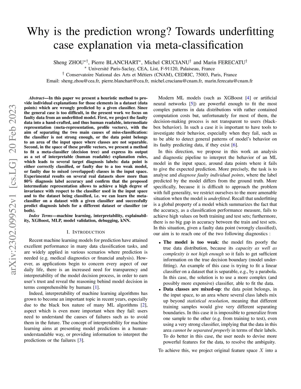 In this paper we present a heuristic method to provide individual explanations for those elements in a dataset (data points) which are wrongly predicted by a given classifier. Since the general case is too difficult, in the present work we focus on faulty data from an underfitted model. First, we project the faulty data into a hand-crafted, and thus human readable, intermediate representation (meta-representation, profile vectors), with the aim of separating the two main causes of miss-classification: the classifier is not strong enough, or the data point belongs to an area of the input space where classes are not separable. Second, in the space of these profile vectors, we present a method to fit a meta-classifier (decision tree) and express its output as a set of interpretable (human readable) explanation rules, which leads to several target diagnosis labels: data point is either correctly classified, or faulty due to a too weak model, or faulty due to mixed (overlapped) classes in the input space. Experimental results on several real datasets show more than 80% diagnosis label accuracy and confirm that the proposed intermediate representation allows to achieve a high degree of invariance with respect to the classifier used in the input space and to the dataset being classified, i.e. we can learn the metaclassifier on a dataset with a given classifier and successfully predict diagnosis labels for a different dataset or classifier (or both).