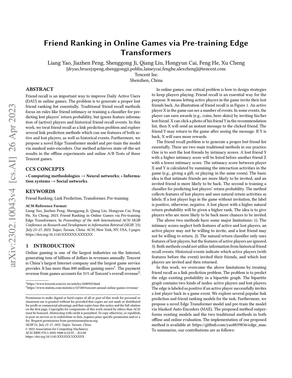 Friend recall is an important way to improve Daily Active Users (DAU) in online games. The problem is to generate a proper lost friend ranking list essentially. Traditional friend recall methods focus on rules like friend intimacy or training a classifier for predicting lost players' return probability, but ignore feature information of (active) players and historical friend recall events. In this work, we treat friend recall as a link prediction problem and explore several link prediction methods which can use features of both active and lost players, as well as historical events. Furthermore, we propose a novel Edge Transformer model and pre-train the model via masked auto-encoders. Our method achieves state-of-the-art results in the offline experiments and online A/B Tests of three Tencent games.