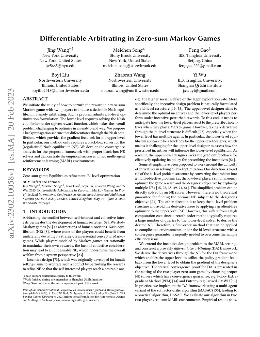 We initiate the study of how to perturb the reward in a zero-sum Markov game with two players to induce a desirable Nash equilibrium, namely arbitrating. Such a problem admits a bi-level optimization formulation. The lower level requires solving the Nash equilibrium under a given reward function, which makes the overall problem challenging to optimize in an end-to-end way. We propose a backpropagation scheme that differentiates through the Nash equilibrium, which provides the gradient feedback for the upper level. In particular, our method only requires a black-box solver for the (regularized) Nash equilibrium (NE). We develop the convergence analysis for the proposed framework with proper black-box NE solvers and demonstrate the empirical successes in two multi-agent reinforcement learning (MARL) environments.