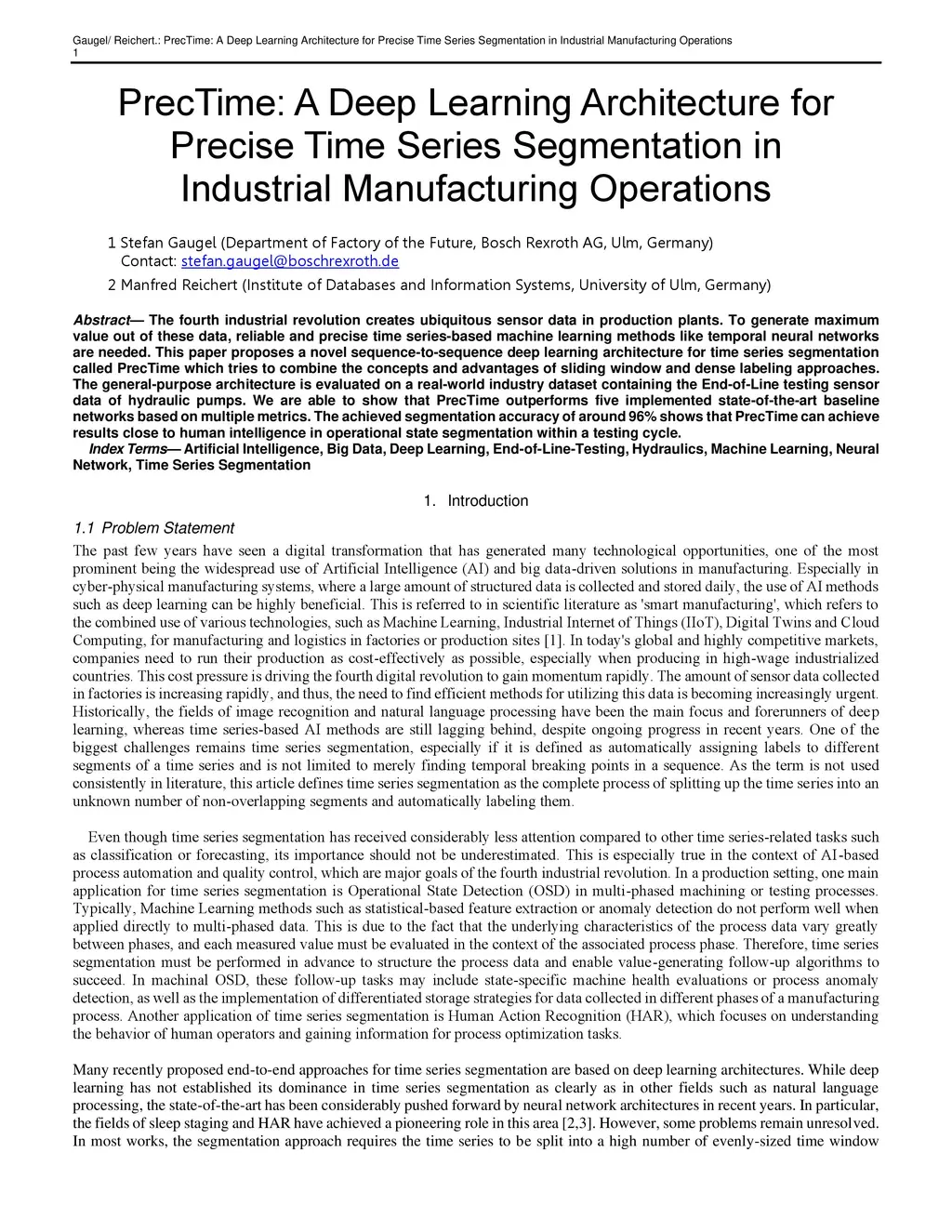 The fourth industrial revolution creates ubiquitous sensor data in production plants. To generate maximum value out of these data, reliable and precise time series-based machine learning methods like temporal neural networks are needed. This paper proposes a novel sequence-to-sequence deep learning architecture for time series segmentation called PrecTime which tries to combine the concepts and advantages of sliding window and dense labeling approaches. The general-purpose architecture is evaluated on a real-world industry dataset containing the End-of-Line testing sensor data of hydraulic pumps. We are able to show that PrecTime outperforms five implemented state-of-the-art baseline networks based on multiple metrics. The achieved segmentation accuracy of around 96% shows that PrecTime can achieve results close to human intelligence in operational state segmentation within a testing cycle.