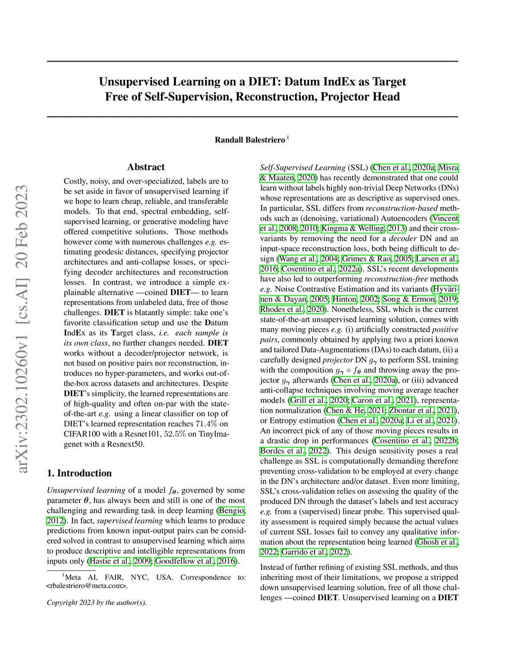 Unsupervised Learning on a DIET: Datum IndEx as Target Free of