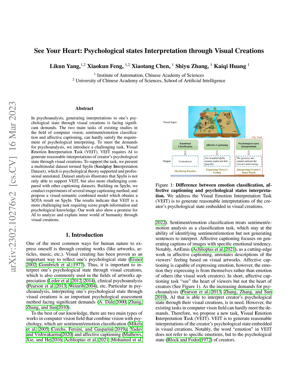 In psychoanalysis, generating interpretations to one's psychological state through visual creations is facing significant demands. The two main tasks of existing studies in the field of computer vision, sentiment/emotion classification and affective captioning, can hardly satisfy the requirement of psychological interpreting. To meet the demands for psychoanalysis, we introduce a challenging task, \textbf{V}isual \textbf{E}motion \textbf{I}nterpretation \textbf{T}ask (VEIT). VEIT requires AI to generate reasonable interpretations of creator's psychological state through visual creations. To support the task, we present a multimodal dataset termed SpyIn (\textbf{S}and\textbf{p}la\textbf{y} \textbf{In}terpretation Dataset), which is psychological theory supported and professional annotated. Dataset analysis illustrates that SpyIn is not only able to support VEIT, but also more challenging compared with other captioning datasets. Building on SpyIn, we conduct experiments of several image captioning method, and propose a visual-semantic combined model which obtains a SOTA result on SpyIn. The results indicate that VEIT is a more challenging task requiring scene graph information and psychological knowledge. Our work also show a promise for AI to analyze and explain inner world of humanity through visual creations.