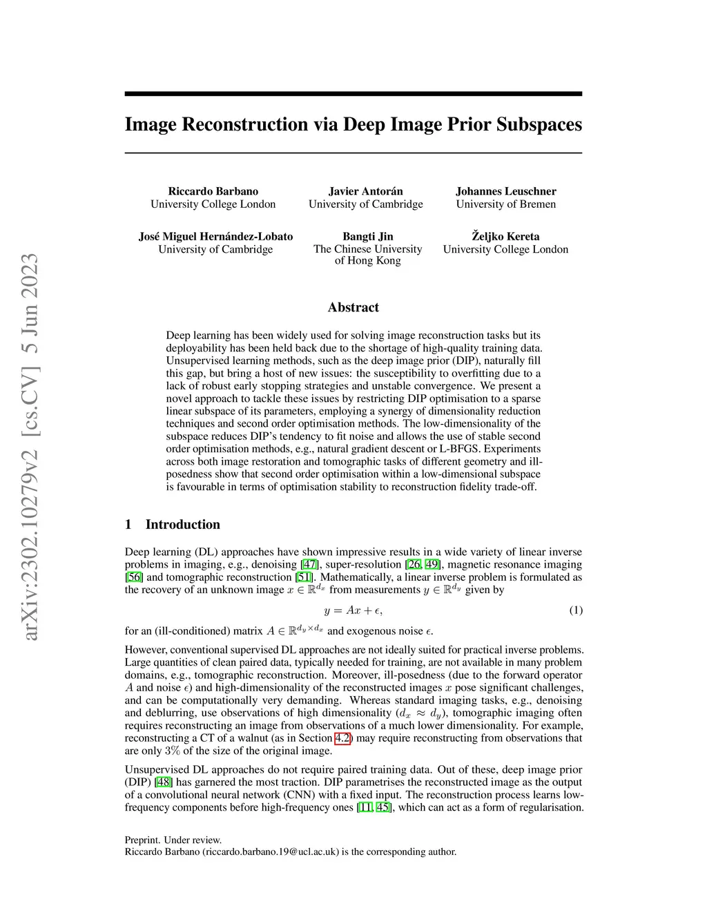 Deep learning has been widely used for solving image reconstruction tasks but its deployability has been held back due to the shortage of high-quality training data. Unsupervised learning methods, such as the deep image prior (DIP), naturally fill this gap, but bring a host of new issues: the susceptibility to overfitting due to a lack of robust early stopping strategies and unstable convergence. We present a novel approach to tackle these issues by restricting DIP optimisation to a sparse linear subspace of its parameters, employing a synergy of dimensionality reduction techniques and second order optimisation methods. The low-dimensionality of the subspace reduces DIP's tendency to fit noise and allows the use of stable second order optimisation methods, e.g., natural gradient descent or L-BFGS. Experiments across both image restoration and tomographic tasks of different geometry and ill-posedness show that second order optimisation within a low-dimensional subspace is favourable in terms of optimisation stability to reconstruction fidelity trade-off.