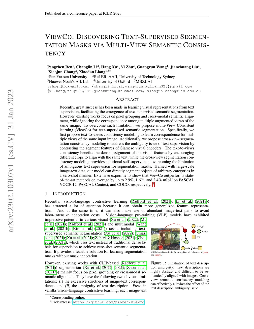 ViewCo: Discovering Text-Supervised Segmentation Masks via Multi-View