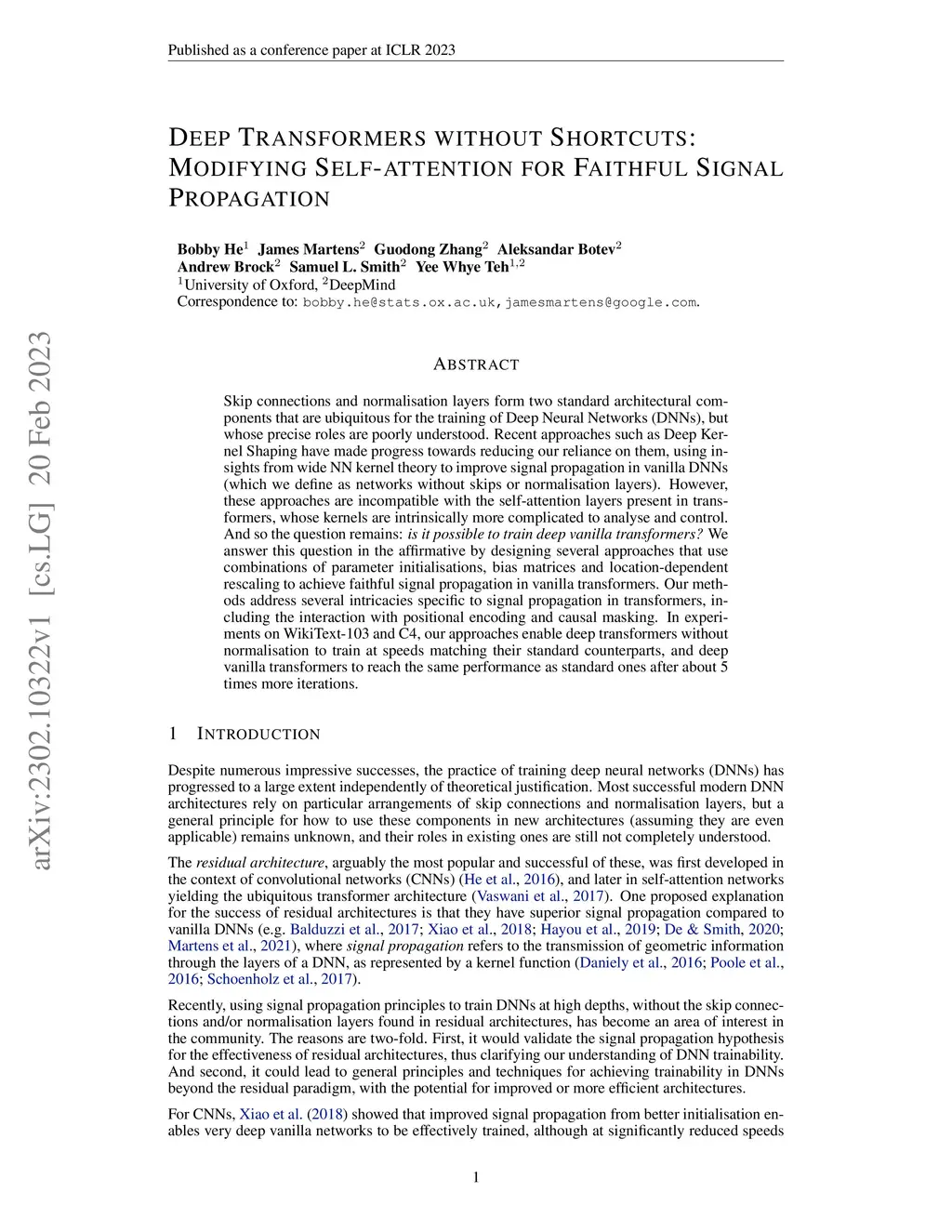 Deep Transformers without Shortcuts: Modifying Self-attention for