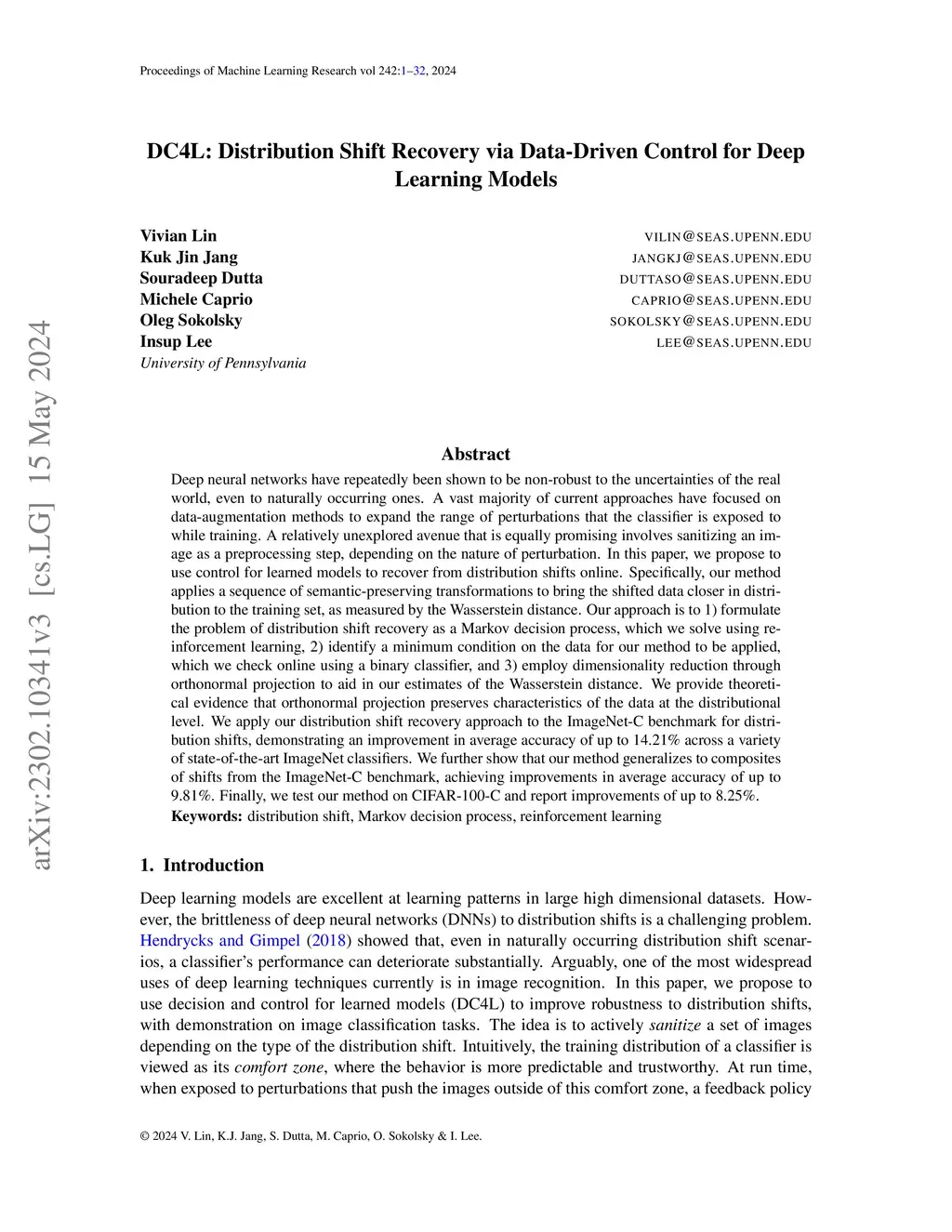 DC4L: Distribution Shift Recovery via Data-Driven Control for Deep