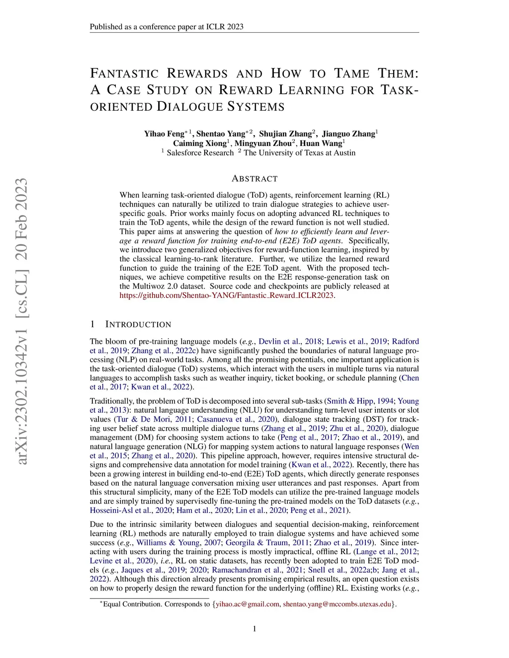 When learning task-oriented dialogue (ToD) agents, reinforcement learning (RL) techniques can naturally be utilized to train dialogue strategies to achieve user-specific goals. Prior works mainly focus on adopting advanced RL techniques to train the ToD agents, while the design of the reward function is not well studied. This paper aims at answering the question of how to efficiently learn and leverage a reward function for training end-to-end (E2E) ToD agents. Specifically, we introduce two generalized objectives for reward-function learning, inspired by the classical learning-to-rank literature. Further, we utilize the learned reward function to guide the training of the E2E ToD agent. With the proposed techniques, we achieve competitive results on the E2E response-generation task on the Multiwoz 2.0 dataset. Source code and checkpoints are publicly released at https://github.com/Shentao-YANG/Fantastic_Reward_ICLR2023.