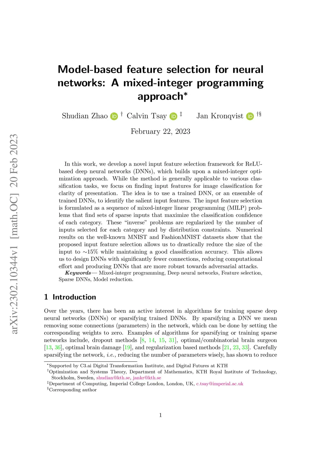 In this work, we develop a novel input feature selection framework for ReLU-based deep neural networks (DNNs), which builds upon a mixed-integer optimization approach. While the method is generally applicable to various classification tasks, we focus on finding input features for image classification for clarity of presentation. The idea is to use a trained DNN, or an ensemble of trained DNNs, to identify the salient input features. The input feature selection is formulated as a sequence of mixed-integer linear programming (MILP) problems that find sets of sparse inputs that maximize the classification confidence of each category. These 'ínverse'' problems are regularized by the number of inputs selected for each category and by distribution constraints. Numerical results on the well-known MNIST and FashionMNIST datasets show that the proposed input feature selection allows us to drastically reduce the size of the input to 15\% while maintaining a good classification accuracy. This allows us to design DNNs with significantly fewer connections, reducing computational effort and producing DNNs that are more robust towards adversarial attacks.