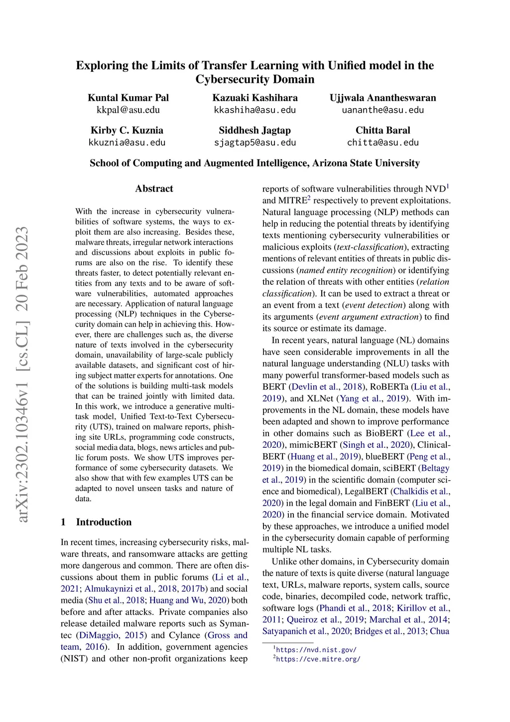 With the increase in cybersecurity vulnerabilities of software systems, the ways to exploit them are also increasing. Besides these, malware threats, irregular network interactions, and discussions about exploits in public forums are also on the rise. To identify these threats faster, to detect potentially relevant entities from any texts, and to be aware of software vulnerabilities, automated approaches are necessary. Application of natural language processing (NLP) techniques in the Cybersecurity domain can help in achieving this. However, there are challenges such as the diverse nature of texts involved in the cybersecurity domain, the unavailability of large-scale publicly available datasets, and the significant cost of hiring subject matter experts for annotations. One of the solutions is building multi-task models that can be trained jointly with limited data. In this work, we introduce a generative multi-task model, Unified Text-to-Text Cybersecurity (UTS), trained on malware reports, phishing site URLs, programming code constructs, social media data, blogs, news articles, and public forum posts. We show UTS improves the performance of some cybersecurity datasets. We also show that with a few examples, UTS can be adapted to novel unseen tasks and the nature of data