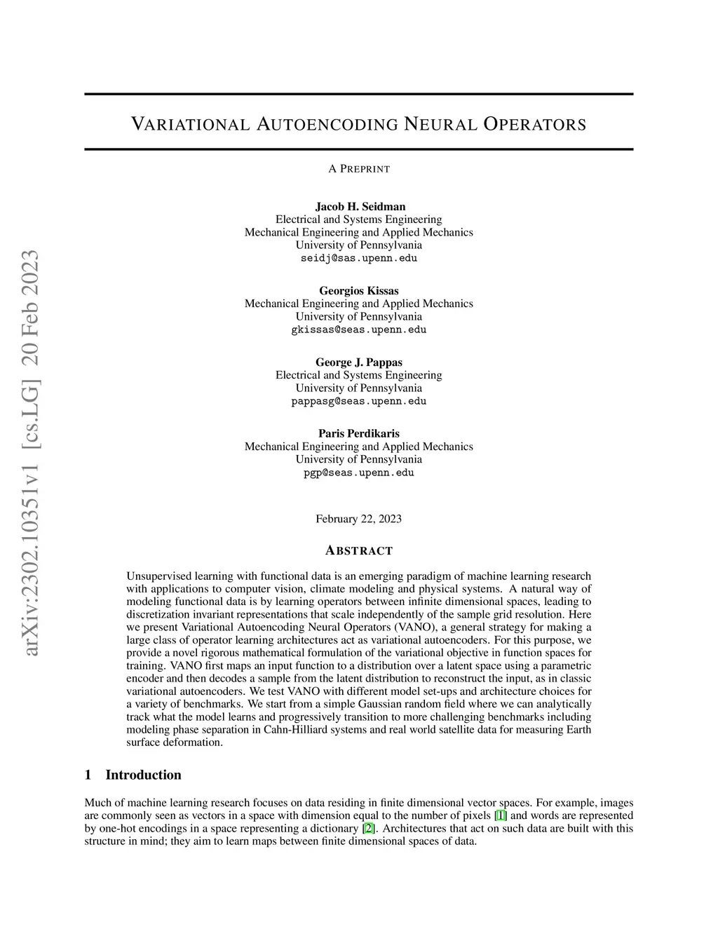 Unsupervised learning with functional data is an emerging paradigm of machine learning research with applications to computer vision, climate modeling and physical systems. A natural way of modeling functional data is by learning operators between infinite dimensional spaces, leading to discretization invariant representations that scale independently of the sample grid resolution. Here we present Variational Autoencoding Neural Operators (VANO), a general strategy for making a large class of operator learning architectures act as variational autoencoders. For this purpose, we provide a novel rigorous mathematical formulation of the variational objective in function spaces for training. VANO first maps an input function to a distribution over a latent space using a parametric encoder and then decodes a sample from the latent distribution to reconstruct the input, as in classic variational autoencoders. We test VANO with different model set-ups and architecture choices for a variety of benchmarks. We start from a simple Gaussian random field where we can analytically track what the model learns and progressively transition to more challenging benchmarks including modeling phase separation in Cahn-Hilliard systems and real world satellite data for measuring Earth surface deformation.