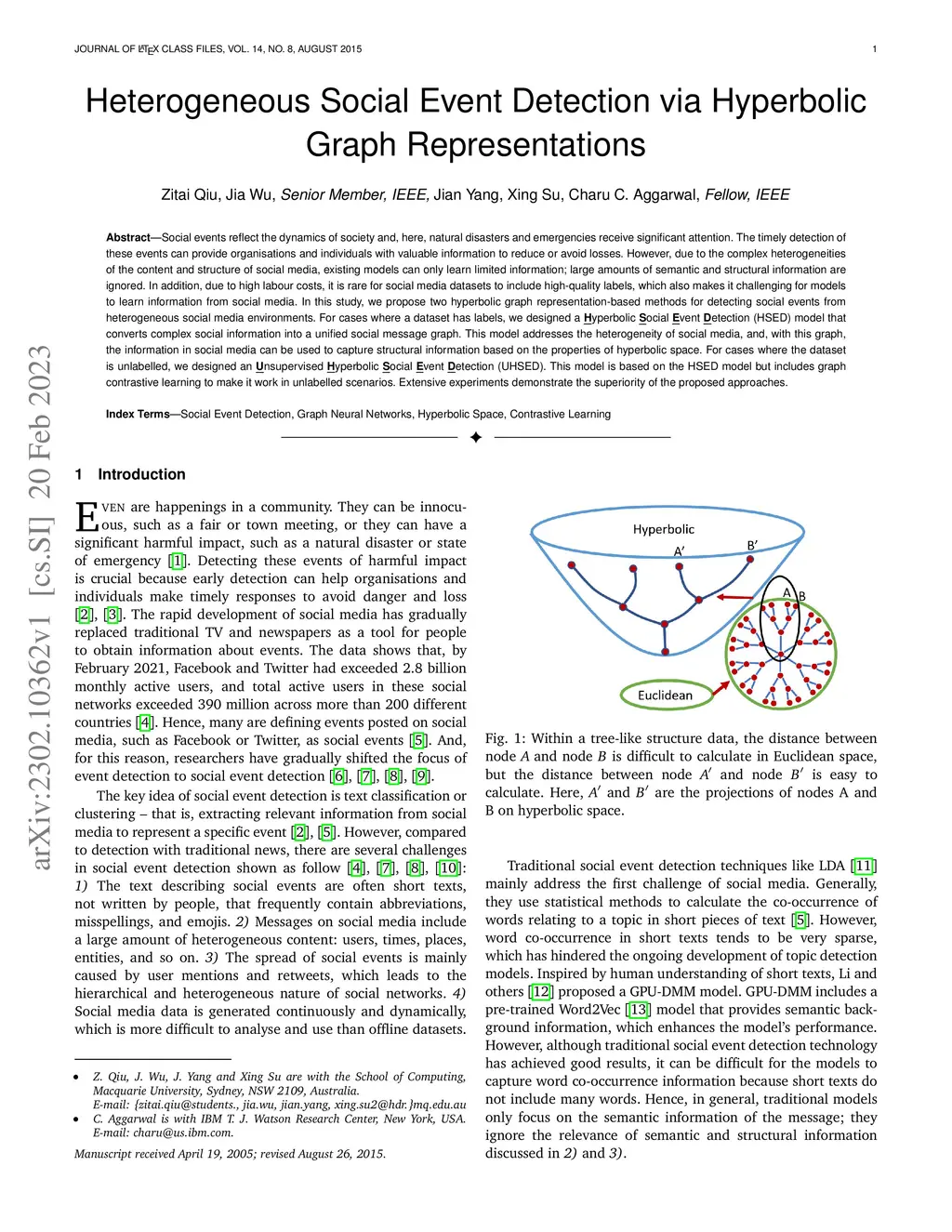 Social events reflect the dynamics of society and, here, natural disasters and emergencies receive significant attention. The timely detection of these events can provide organisations and individuals with valuable information to reduce or avoid losses. However, due to the complex heterogeneities of the content and structure of social media, existing models can only learn limited information; large amounts of semantic and structural information are ignored. In addition, due to high labour costs, it is rare for social media datasets to include high-quality labels, which also makes it challenging for models to learn information from social media. In this study, we propose two hyperbolic graph representation-based methods for detecting social events from heterogeneous social media environments. For cases where a dataset has labels, we designed a Hyperbolic Social Event Detection (HSED) model that converts complex social information into a unified social message graph. This model addresses the heterogeneity of social media, and, with this graph, the information in social media can be used to capture structural information based on the properties of hyperbolic space. For cases where the dataset is unlabelled, we designed an Unsupervised Hyperbolic Social Event Detection (UHSED). This model is based on the HSED model but includes graph contrastive learning to make it work in unlabelled scenarios. Extensive experiments demonstrate the superiority of the proposed approaches.