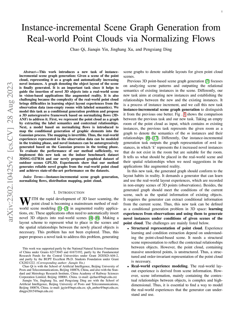 This work introduces a new task of instance-incremental scene graph generation: Given a scene of the point cloud, representing it as a graph and automatically increasing novel instances. A graph denoting the object layout of the scene is finally generated. It is an important task since it helps to guide the insertion of novel 3D objects into a real-world scene in vision-based applications like augmented reality. It is also challenging because the complexity of the real-world point cloud brings difficulties in learning object layout experiences from the observation data (non-empty rooms with labeled semantics). We model this task as a conditional generation problem and propose a 3D autoregressive framework based on normalizing flows (3D-ANF) to address it. First, we represent the point cloud as a graph by extracting the label semantics and contextual relationships. Next, a model based on normalizing flows is introduced to map the conditional generation of graphic elements into the Gaussian process. The mapping is invertible. Thus, the real-world experiences represented in the observation data can be modeled in the training phase, and novel instances can be autoregressively generated based on the Gaussian process in the testing phase. To evaluate the performance of our method sufficiently, we implement this new task on the indoor benchmark dataset 3DSSG-O27R16 and our newly proposed graphical dataset of outdoor scenes GPL3D. Experiments show that our method generates reliable novel graphs from the real-world point cloud and achieves state-of-the-art performance on the datasets.