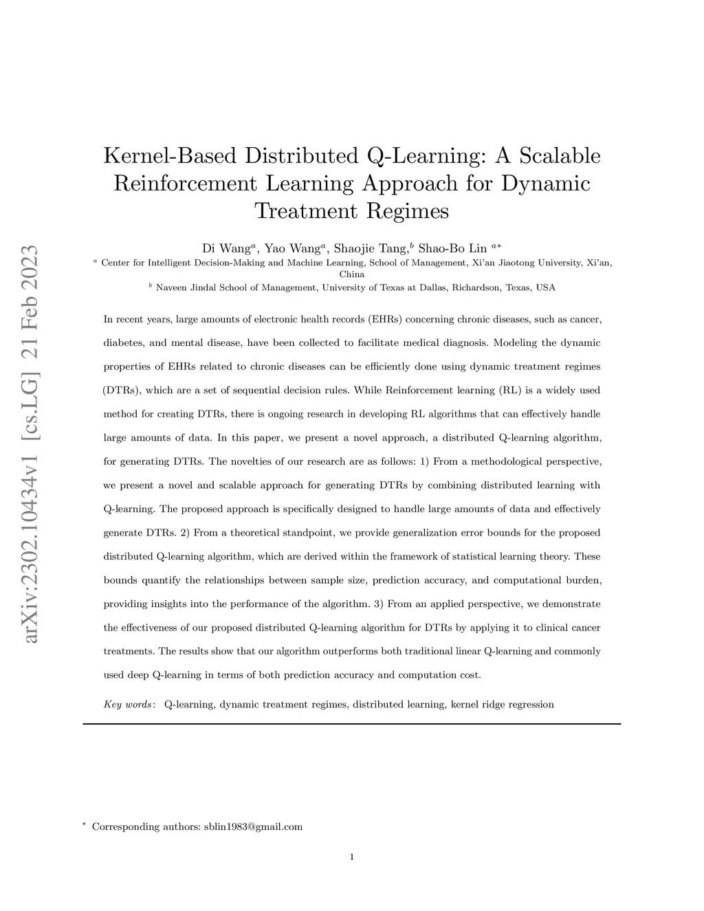 In recent years, large amounts of electronic health records (EHRs) concerning chronic diseases have been collected to facilitate medical diagnosis. Modeling the dynamic properties of EHRs related to chronic diseases can be efficiently done using dynamic treatment regimes (DTRs). While reinforcement learning (RL) is a widely used method for creating DTRs, there is ongoing research in developing RL algorithms that can effectively handle large amounts of data. In this paper, we present a scalable kernel-based distributed Q-learning algorithm for generating DTRs. We perform both theoretical assessments and numerical analysis for the proposed approach. The results demonstrate that our algorithm significantly reduces the computational complexity associated with the state-of-the-art deep reinforcement learning methods, while maintaining comparable generalization performance in terms of accumulated rewards across stages, such as survival time or cumulative survival probability.