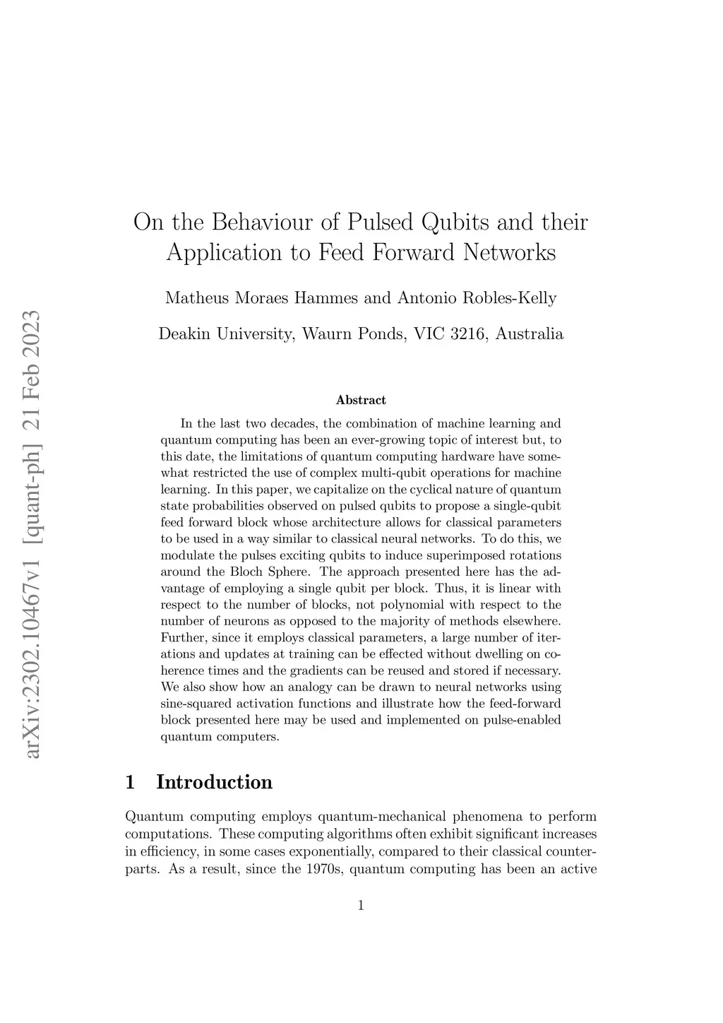 In the last two decades, the combination of machine learning and quantum computing has been an ever-growing topic of interest but, to this date, the limitations of quantum computing hardware have somewhat restricted the use of complex multi-qubit operations for machine learning. In this paper, we capitalize on the cyclical nature of quantum state probabilities observed on pulsed qubits to propose a single-qubit feed forward block whose architecture allows for classical parameters to be used in a way similar to classical neural networks. To do this, we modulate the pulses exciting qubits to induce superimposed rotations around the Bloch Sphere. The approach presented here has the advantage of employing a single qubit per block. Thus, it is linear with respect to the number of blocks, not polynomial with respect to the number of neurons as opposed to the majority of methods elsewhere. Further, since it employs classical parameters, a large number of iterations and updates at training can be effected without dwelling on coherence times and the gradients can be reused and stored if necessary. We also show how an analogy can be drawn to neural networks using sine-squared activation functions and illustrate how the feed-forward block presented here may be used and implemented on pulse-enabled quantum computers.
