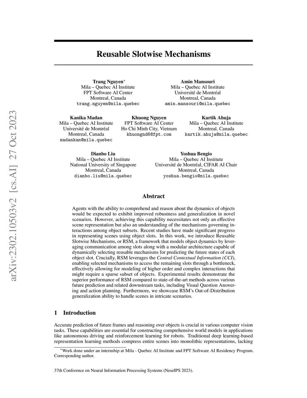 Agents with the ability to comprehend and reason about the dynamics of objects would be expected to exhibit improved robustness and generalization in novel scenarios. However, achieving this capability necessitates not only an effective scene representation but also an understanding of the mechanisms governing interactions among object subsets. Recent studies have made significant progress in representing scenes using object slots. In this work, we introduce Reusable Slotwise Mechanisms, or RSM, a framework that models object dynamics by leveraging communication among slots along with a modular architecture capable of dynamically selecting reusable mechanisms for predicting the future states of each object slot. Crucially, RSM leverages the Central Contextual Information (CCI), enabling selected mechanisms to access the remaining slots through a bottleneck, effectively allowing for modeling of higher order and complex interactions that might require a sparse subset of objects. Experimental results demonstrate the superior performance of RSM compared to state-of-the-art methods across various future prediction and related downstream tasks, including Visual Question Answering and action planning. Furthermore, we showcase RSM's Out-of-Distribution generalization ability to handle scenes in intricate scenarios.