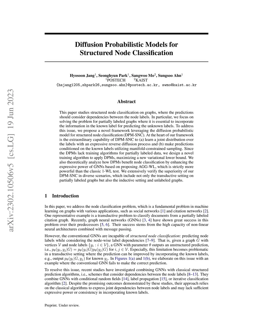 This paper studies structured node classification on graphs, where the predictions should consider dependencies between the node labels. In particular, we focus on solving the problem for partially labeled graphs where it is essential to incorporate the information in the known label for predicting the unknown labels. To address this issue, we propose a novel framework leveraging the diffusion probabilistic model for structured node classification (DPM-SNC). At the heart of our framework is the extraordinary capability of DPM-SNC to (a) learn a joint distribution over the labels with an expressive reverse diffusion process and (b) make predictions conditioned on the known labels utilizing manifold-constrained sampling. Since the DPMs lack training algorithms for partially labeled data, we design a novel training algorithm to apply DPMs, maximizing a new variational lower bound. We also theoretically analyze how DPMs benefit node classification by enhancing the expressive power of GNNs based on proposing AGG-WL, which is strictly more powerful than the classic 1-WL test. We extensively verify the superiority of our DPM-SNC in diverse scenarios, which include not only the transductive setting on partially labeled graphs but also the inductive setting and unlabeled graphs.