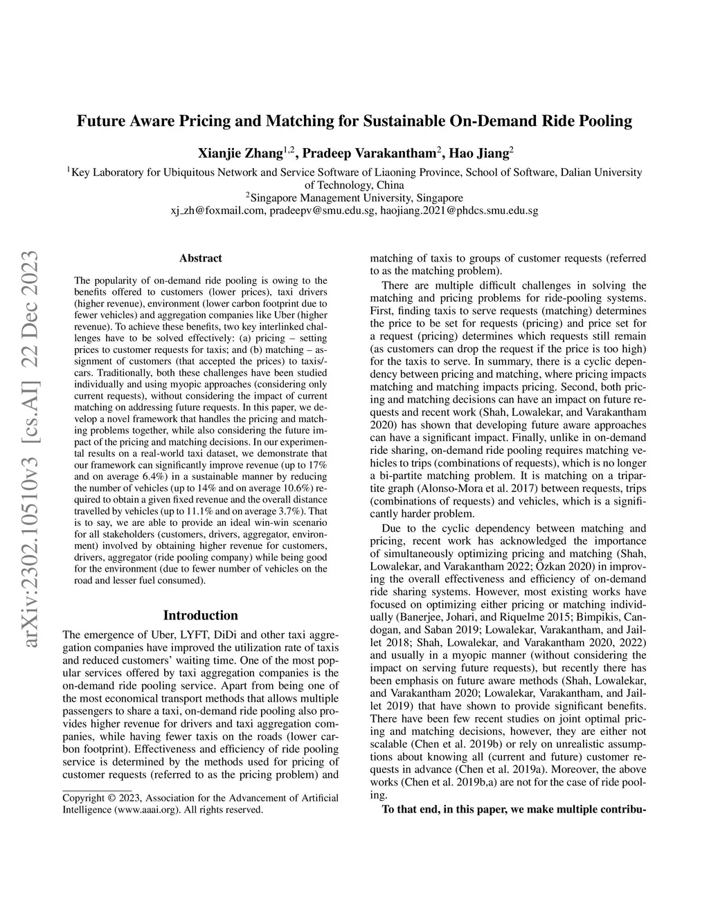The popularity of on-demand ride pooling is owing to the benefits offered to customers (lower prices), taxi drivers (higher revenue), environment (lower carbon footprint due to fewer vehicles) and aggregation companies like Uber (higher revenue). To achieve these benefits, two key interlinked challenges have to be solved effectively: (a) pricing -- setting prices to customer requests for taxis; and (b) matching -- assignment of customers (that accepted the prices) to taxis/cars. Traditionally, both these challenges have been studied individually and using myopic approaches (considering only current requests), without considering the impact of current matching on addressing future requests. In this paper, we develop a novel framework that handles the pricing and matching problems together, while also considering the future impact of the pricing and matching decisions. In our experimental results on a real-world taxi dataset, we demonstrate that our framework can significantly improve revenue (up to 17% and on average 6.4%) in a sustainable manner by reducing the number of vehicles (up to 14% and on average 10.6%) required to obtain a given fixed revenue and the overall distance travelled by vehicles (up to 11.1% and on average 3.7%). That is to say, we are able to provide an ideal win-win scenario for all stakeholders (customers, drivers, aggregator, environment) involved by obtaining higher revenue for customers, drivers, aggregator (ride pooling company) while being good for the environment (due to fewer number of vehicles on the road and lesser fuel consumed).