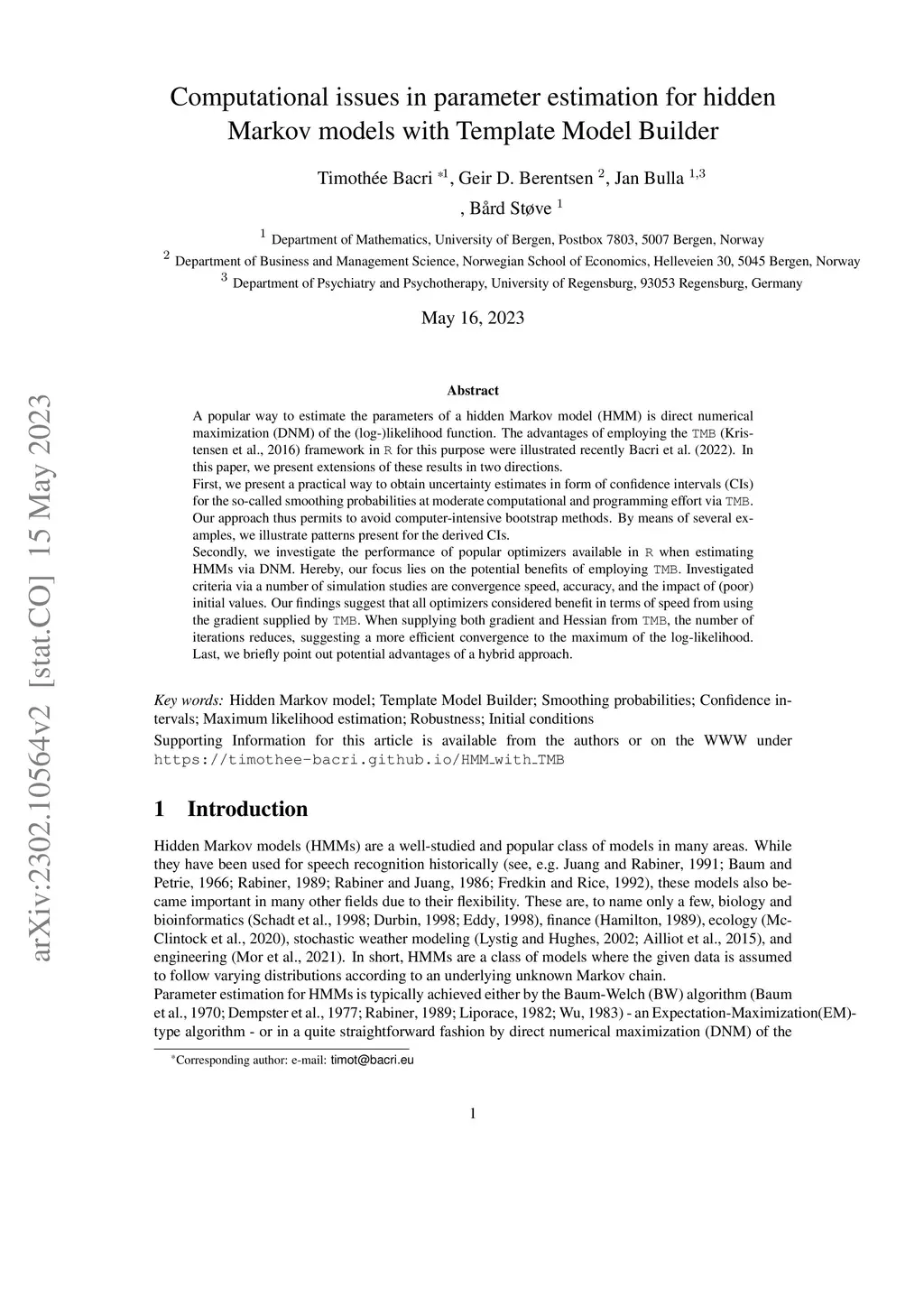 A popular way to estimate the parameters of a hidden Markov model (HMM) is direct numerical maximization (DNM) of the (log-)likelihood function. The advantages of employing the TMB (Kristensen et al., 2016) framework in R for this purpose were illustrated recently Bacri et al. (2022). In this paper, we present extensions of these results in two directions. First, we present a practical way to obtain uncertainty estimates in form of confidence intervals (CIs) for the so-called smoothing probabilities at moderate computational and programming effort via TMB. Our approach thus permits to avoid computer-intensive bootstrap methods. By means of several examples, we illustrate patterns present for the derived CIs. Secondly, we investigate the performance of popular optimizers available in R when estimating HMMs via DNM. Hereby, our focus lies on the potential benefits of employing TMB. Investigated criteria via a number of simulation studies are convergence speed, accuracy, and the impact of (poor) initial values. Our findings suggest that all optimizers considered benefit in terms of speed from using the gradient supplied by TMB. When supplying both gradient and Hessian from TMB, the number of iterations reduces, suggesting a more efficient convergence to the maximum of the log-likelihood. Last, we briefly point out potential advantages of a hybrid approach.