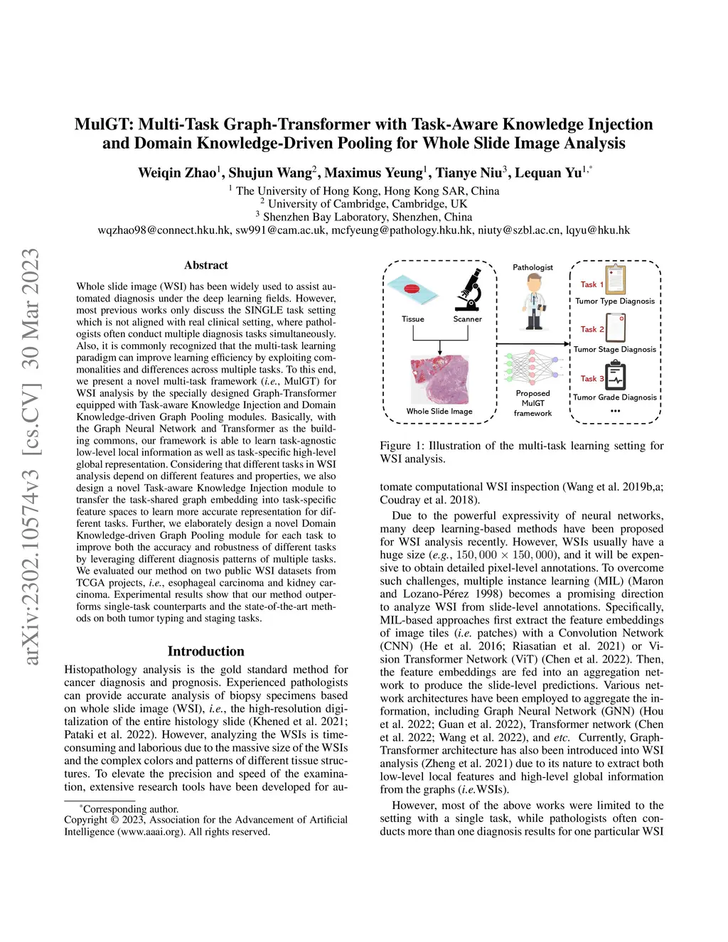 Whole slide image (WSI) has been widely used to assist automated diagnosis under the deep learning fields. However, most previous works only discuss the SINGLE task setting which is not aligned with real clinical setting, where pathologists often conduct multiple diagnosis tasks simultaneously. Also, it is commonly recognized that the multi-task learning paradigm can improve learning efficiency by exploiting commonalities and differences across multiple tasks. To this end, we present a novel multi-task framework (i.e., MulGT) for WSI analysis by the specially designed Graph-Transformer equipped with Task-aware Knowledge Injection and Domain Knowledge-driven Graph Pooling modules. Basically, with the Graph Neural Network and Transformer as the building commons, our framework is able to learn task-agnostic low-level local information as well as task-specific high-level global representation. Considering that different tasks in WSI analysis depend on different features and properties, we also design a novel Task-aware Knowledge Injection module to transfer the task-shared graph embedding into task-specific feature spaces to learn more accurate representation for different tasks. Further, we elaborately design a novel Domain Knowledge-driven Graph Pooling module for each task to improve both the accuracy and robustness of different tasks by leveraging different diagnosis patterns of multiple tasks. We evaluated our method on two public WSI datasets from TCGA projects, i.e., esophageal carcinoma and kidney carcinoma. Experimental results show that our method outperforms single-task counterparts and the state-of-theart methods on both tumor typing and staging tasks.