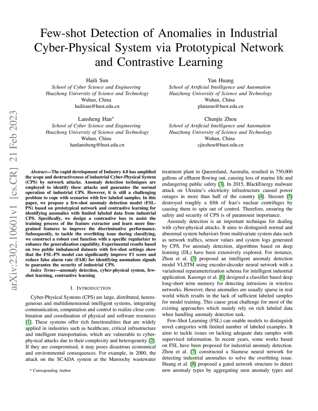 The rapid development of Industry 4.0 has amplified the scope and destructiveness of industrial Cyber-Physical System (CPS) by network attacks. Anomaly detection techniques are employed to identify these attacks and guarantee the normal operation of industrial CPS. However, it is still a challenging problem to cope with scenarios with few labeled samples. In this paper, we propose a few-shot anomaly detection model (FSL-PN) based on prototypical network and contrastive learning for identifying anomalies with limited labeled data from industrial CPS. Specifically, we design a contrastive loss to assist the training process of the feature extractor and learn more fine-grained features to improve the discriminative performance. Subsequently, to tackle the overfitting issue during classifying, we construct a robust cost function with a specific regularizer to enhance the generalization capability. Experimental results based on two public imbalanced datasets with few-shot settings show that the FSL-PN model can significantly improve F1 score and reduce false alarm rate (FAR) for identifying anomalous signals to guarantee the security of industrial CPS.