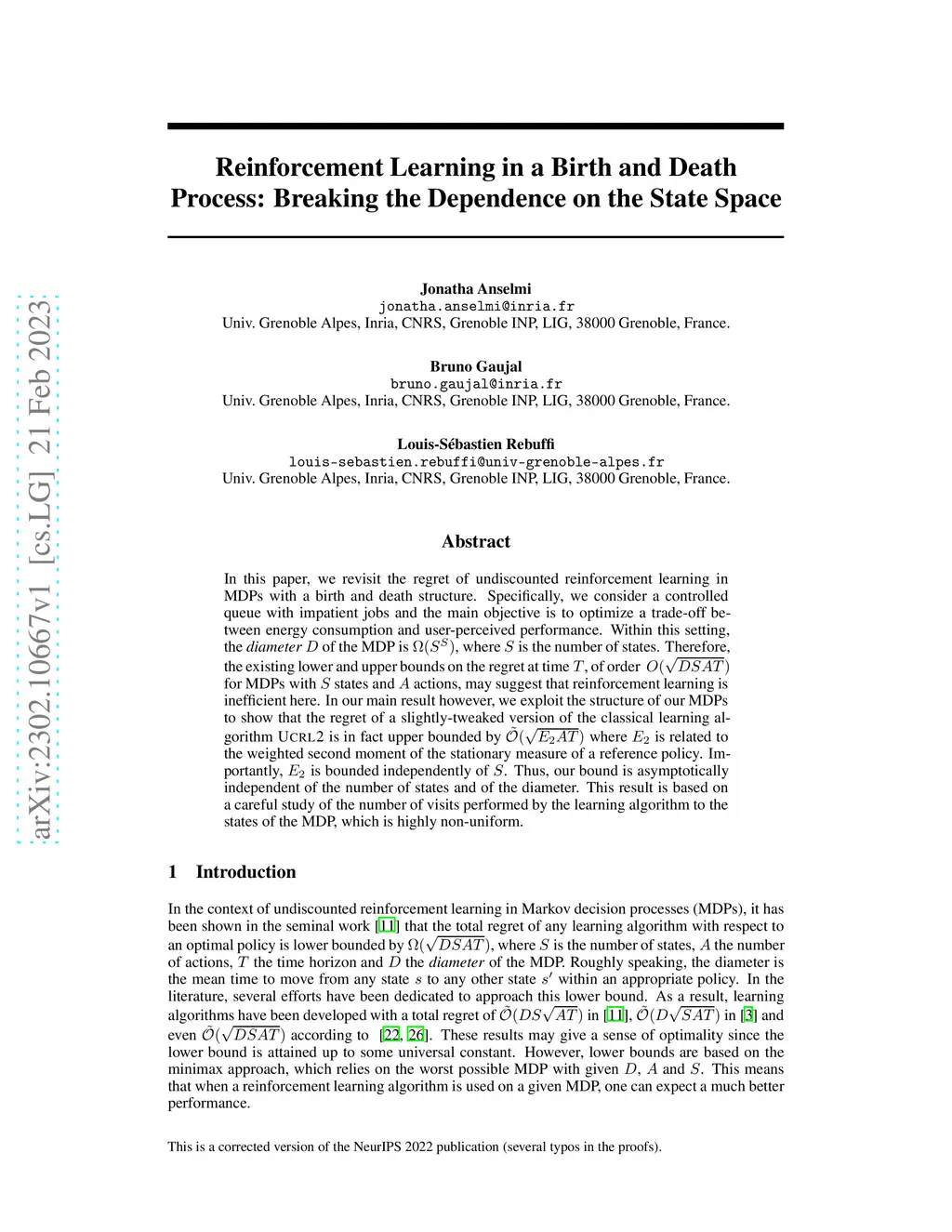 In this paper, we revisit the regret of undiscounted reinforcement learning in MDPs with a birth and death structure. Specifically, we consider a controlled queue with impatient jobs and the main objective is to optimize a trade-off between energy consumption and user-perceived performance. Within this setting, the \emph{diameter} of the MDP is , where is the number of states. Therefore, the existing lower and upper bounds on the regret at time, of order for MDPs with states and actions, may suggest that reinforcement learning is inefficient here. In our main result however, we exploit the structure of our MDPs to show that the regret of a slightly-tweaked version of the classical learning algorithm {\sc Ucrl2} is in fact upper bounded by where is related to the weighted second moment of the stationary measure of a reference policy. Importantly, is bounded independently of . Thus, our bound is asymptotically independent of the number of states and of the diameter. This result is based on a careful study of the number of visits performed by the learning algorithm to the states of the MDP, which is highly non-uniform.