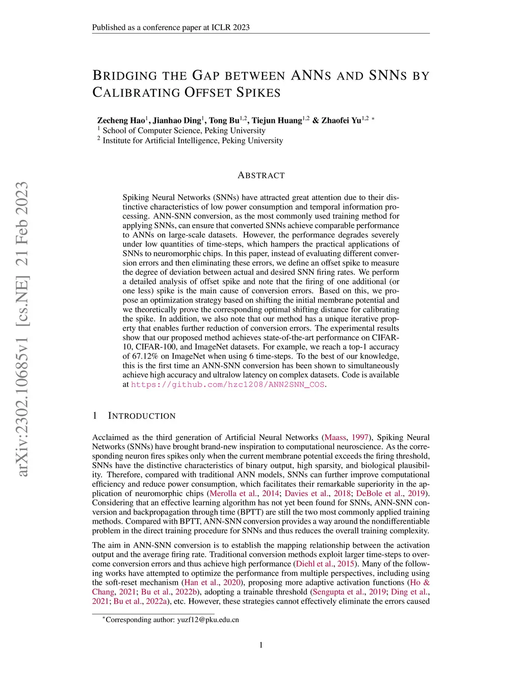 Spiking Neural Networks (SNNs) have attracted great attention due to their distinctive characteristics of low power consumption and temporal information processing. ANN-SNN conversion, as the most commonly used training method for applying SNNs, can ensure that converted SNNs achieve comparable performance to ANNs on large-scale datasets. However, the performance degrades severely under low quantities of time-steps, which hampers the practical applications of SNNs to neuromorphic chips. In this paper, instead of evaluating different conversion errors and then eliminating these errors, we define an offset spike to measure the degree of deviation between actual and desired SNN firing rates. We perform a detailed analysis of offset spike and note that the firing of one additional (or one less) spike is the main cause of conversion errors. Based on this, we propose an optimization strategy based on shifting the initial membrane potential and we theoretically prove the corresponding optimal shifting distance for calibrating the spike. In addition, we also note that our method has a unique iterative property that enables further reduction of conversion errors. The experimental results show that our proposed method achieves state-of-the-art performance on CIFAR-10, CIFAR-100, and ImageNet datasets. For example, we reach a top-1 accuracy of 67.12% on ImageNet when using 6 time-steps. To the best of our knowledge, this is the first time an ANN-SNN conversion has been shown to simultaneously achieve high accuracy and ultralow latency on complex datasets. Code is available at https://github.com/hzc1208/ANN2SNN_COS.