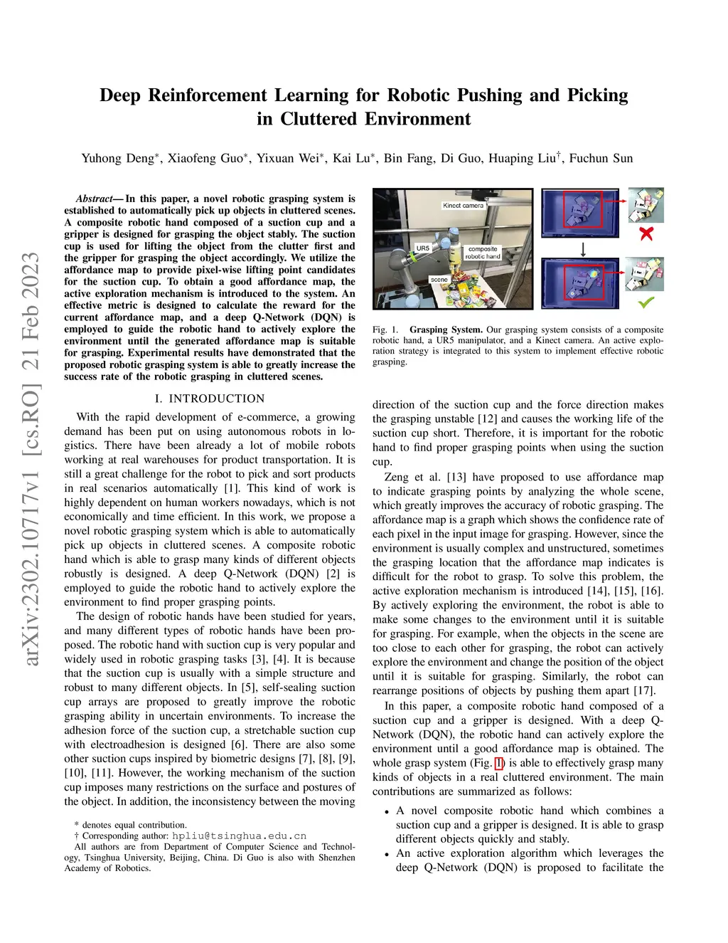 In this paper, a novel robotic grasping system is established to automatically pick up objects in cluttered scenes. A composite robotic hand composed of a suction cup and a gripper is designed for grasping the object stably. The suction cup is used for lifting the object from the clutter first and the gripper for grasping the object accordingly. We utilize the affordance map to provide pixel-wise lifting point candidates for the suction cup. To obtain a good affordance map, the active exploration mechanism is introduced to the system. An effective metric is designed to calculate the reward for the current affordance map, and a deep Q-Network (DQN) is employed to guide the robotic hand to actively explore the environment until the generated affordance map is suitable for grasping. Experimental results have demonstrated that the proposed robotic grasping system is able to greatly increase the success rate of the robotic grasping in cluttered scenes.