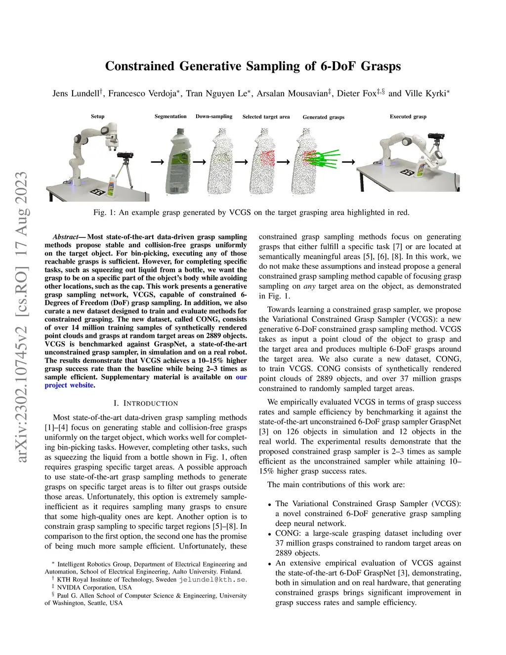 Most state-of-the-art data-driven grasp sampling methods propose stable and collision-free grasps uniformly on the target object. For bin-picking, executing any of those reachable grasps is sufficient. However, for completing specific tasks, such as squeezing out liquid from a bottle, we want the grasp to be on a specific part of the object's body while avoiding other locations, such as the cap. This work presents a generative grasp sampling network, VCGS, capable of constrained 6 Degrees of Freedom (DoF) grasp sampling. In addition, we also curate a new dataset designed to train and evaluate methods for constrained grasping. The new dataset, called CONG, consists of over 14 million training samples of synthetically rendered point clouds and grasps at random target areas on 2889 objects. VCGS is benchmarked against GraspNet, a state-of-the-art unconstrained grasp sampler, in simulation and on a real robot. The results demonstrate that VCGS achieves a 10-15% higher grasp success rate than the baseline while being 2-3 times as sample efficient. Supplementary material is available on our project website.