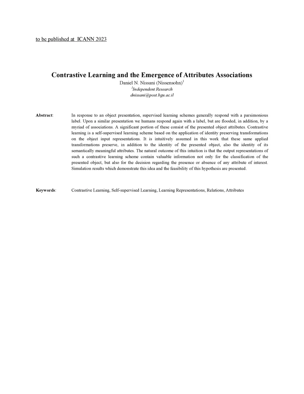 In response to an object presentation, supervised learning schemes generally respond with a parsimonious label. Upon a similar presentation we humans respond again with a label, but are flooded, in addition, by a myriad of associations. A significant portion of these consist of the presented object attributes. Contrastive learning is a semi-supervised learning scheme based on the application of identity preserving transformations on the object input representations. It is conjectured in this work that these same applied transformations preserve, in addition to the identity of the presented object, also the identity of its semantically meaningful attributes. The corollary of this is that the output representations of such a contrastive learning scheme contain valuable information not only for the classification of the presented object, but also for the presence or absence decision of any attribute of interest. Simulation results which demonstrate this idea and the feasibility of this conjecture are presented.