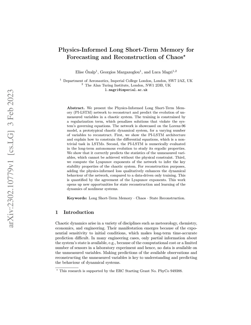 We present the Physics-Informed Long Short-Term Memory (PI-LSTM) network to reconstruct and predict the evolution of unmeasured variables in a chaotic system. The training is constrained by a regularization term, which penalizes solutions that violate the system's governing equations. The network is showcased on the Lorenz-96 model, a prototypical chaotic dynamical system, for a varying number of variables to reconstruct. First, we show the PI-LSTM architecture and explain how to constrain the differential equations, which is a non-trivial task in LSTMs. Second, the PI-LSTM is numerically evaluated in the long-term autonomous evolution to study its ergodic properties. We show that it correctly predicts the statistics of the unmeasured variables, which cannot be achieved without the physical constraint. Third, we compute the Lyapunov exponents of the network to infer the key stability properties of the chaotic system. For reconstruction purposes, adding the physics-informed loss qualitatively enhances the dynamical behaviour of the network, compared to a data-driven only training. This is quantified by the agreement of the Lyapunov exponents. This work opens up new opportunities for state reconstruction and learning of the dynamics of nonlinear systems.