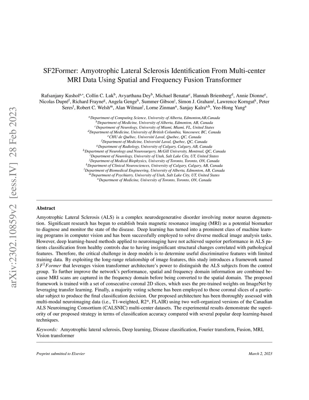 SF2Former: Amyotrophic Lateral Sclerosis Identification From Multi-center MRI Data Using Spatial and Frequency Fusion Transformer
