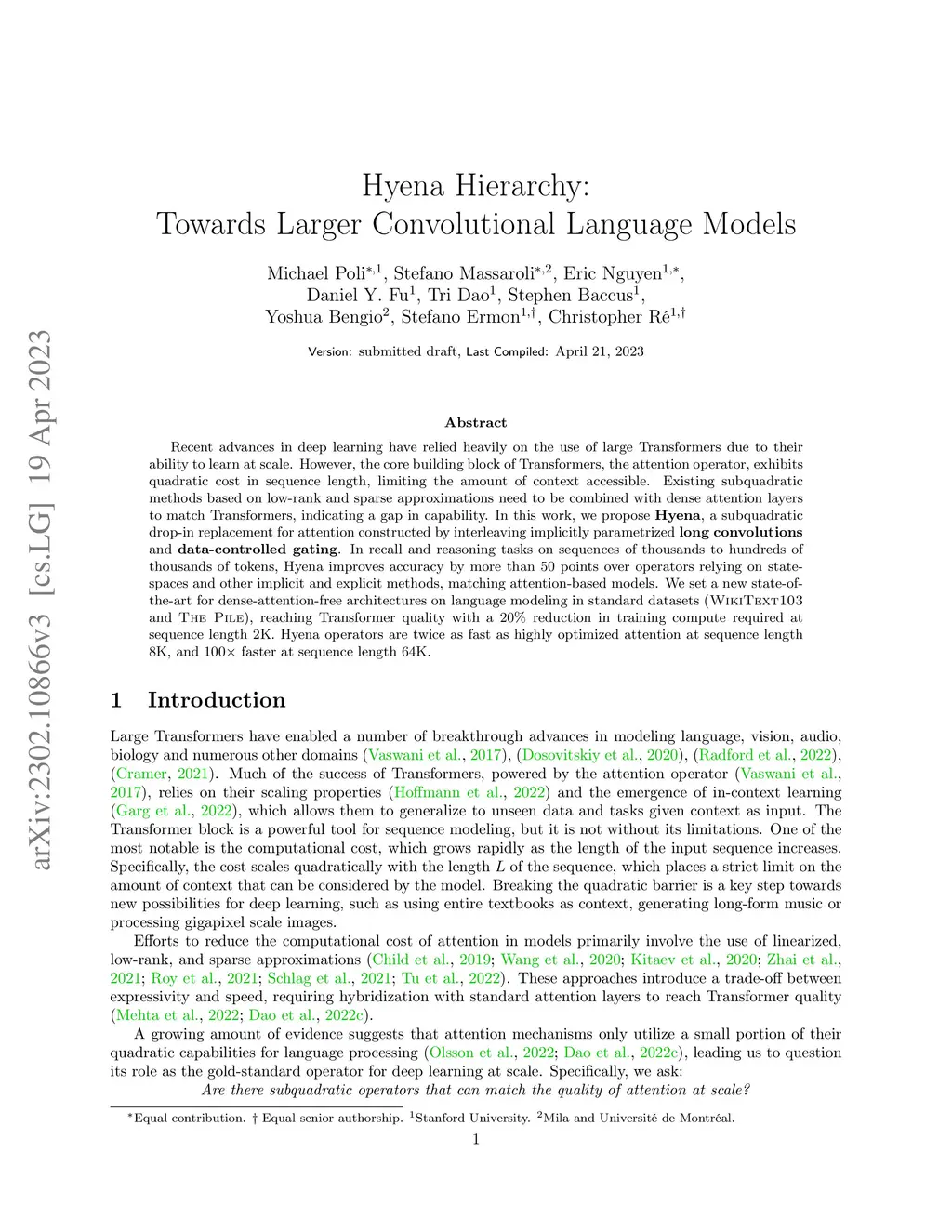 Recent advances in deep learning have relied heavily on the use of large Transformers due to their ability to learn at scale. However, the core building block of Transformers, the attention operator, exhibits quadratic cost in sequence length, limiting the amount of context accessible. Existing subquadratic methods based on low-rank and sparse approximations need to be combined with dense attention layers to match Transformers, indicating a gap in capability. In this work, we propose Hyena, a subquadratic drop-in replacement for attention constructed by interleaving implicitly parametrized long convolutions and data-controlled gating. In recall and reasoning tasks on sequences of thousands to hundreds of thousands of tokens, Hyena improves accuracy by more than 50 points over operators relying on state-spaces and other implicit and explicit methods, matching attention-based models. We set a new state-of-the-art for dense-attention-free architectures on language modeling in standard datasets (WikiText103 and The Pile), reaching Transformer quality with a 20% reduction in training compute required at sequence length 2K. Hyena operators are twice as fast as highly optimized attention at sequence length 8K, and 100x faster at sequence length 64K.