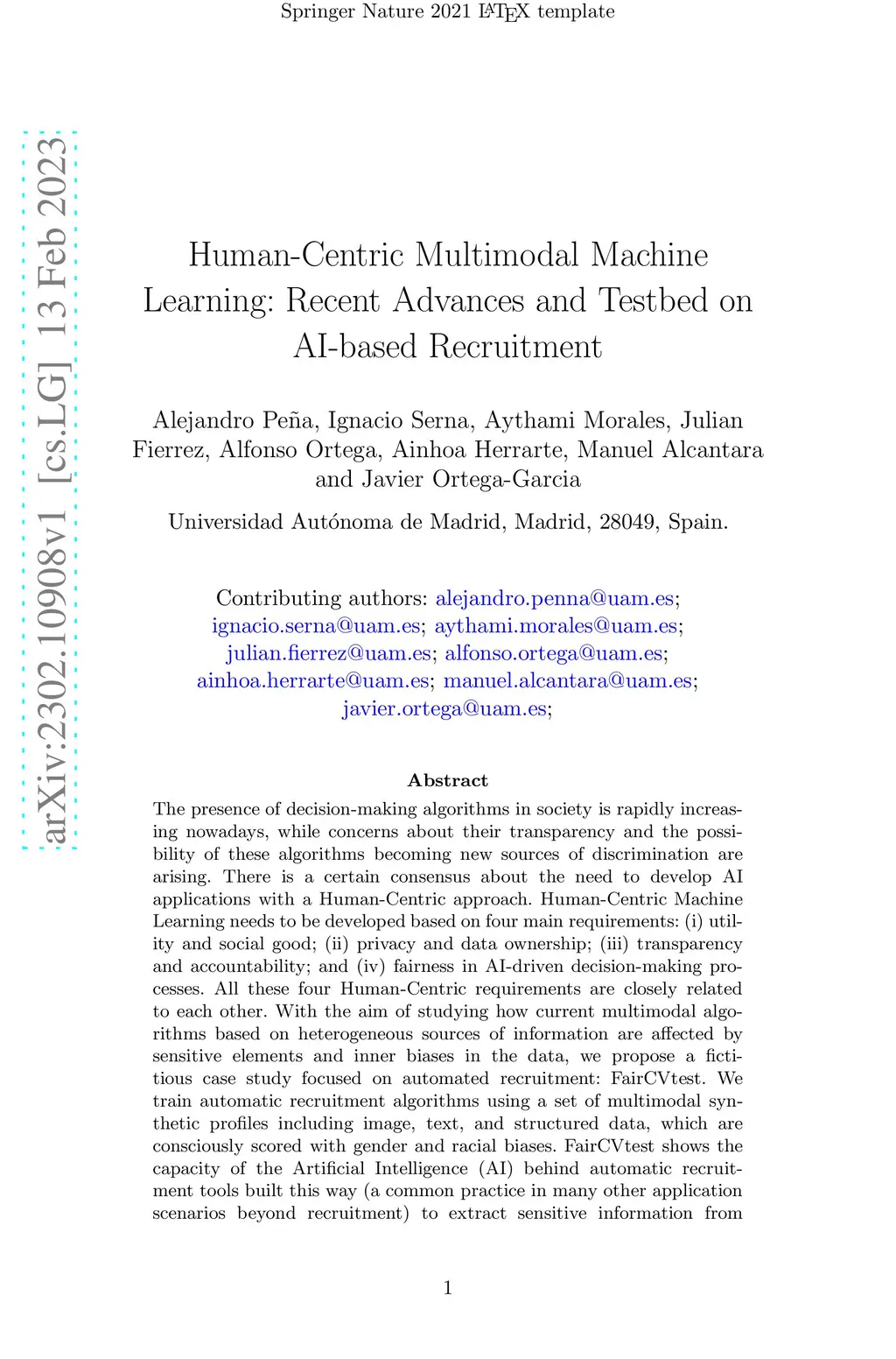 The presence of decision-making algorithms in society is rapidly increasing nowadays, while concerns about their transparency and the possibility of these algorithms becoming new sources of discrimination are arising. There is a certain consensus about the need to develop AI applications with a Human-Centric approach. Human-Centric Machine Learning needs to be developed based on four main requirements: (i) utility and social good; (ii) privacy and data ownership; (iii) transparency and accountability; and (iv) fairness in AI-driven decision-making processes. All these four Human-Centric requirements are closely related to each other. With the aim of studying how current multimodal algorithms based on heterogeneous sources of information are affected by sensitive elements and inner biases in the data, we propose a fictitious case study focused on automated recruitment: FairCVtest. We train automatic recruitment algorithms using a set of multimodal synthetic profiles including image, text, and structured data, which are consciously scored with gender and racial biases. FairCVtest shows the capacity of the Artificial Intelligence (AI) behind automatic recruitment tools built this way (a common practice in many other application scenarios beyond recruitment) to extract sensitive information from unstructured data and exploit it in combination to data biases in undesirable (unfair) ways. We present an overview of recent works developing techniques capable of removing sensitive information and biases from the decision-making process of deep learning architectures, as well as commonly used databases for fairness research in AI. We demonstrate how learning approaches developed to guarantee privacy in latent spaces can lead to unbiased and fair automatic decision-making process.