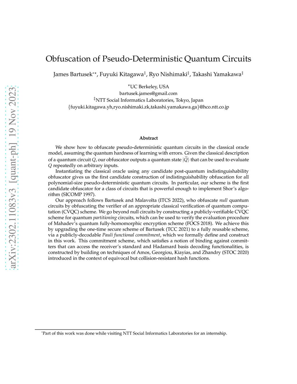 We show how to obfuscate pseudo-deterministic quantum circuits in the classical oracle model, assuming the quantum hardness of learning with errors. Given the classical description of a quantum circuit , our obfuscator outputs a quantum state that can be used to evaluate repeatedly on arbitrary inputs. Instantiating the classical oracle using any candidate post-quantum indistinguishability obfuscator gives us the first candidate construction of indistinguishability obfuscation for all polynomial-size pseudo-deterministic quantum circuits. In particular, our scheme is the first candidate obfuscator for a class of circuits that is powerful enough to implement Shor's algorithm (SICOMP 1997). Our approach follows Bartusek and Malavolta (ITCS 2022), who obfuscate \emph{null} quantum circuits by obfuscating the verifier of an appropriate classical verification of quantum computation (CVQC) scheme. We go beyond null circuits by constructing a publicly-verifiable CVQC scheme for quantum \emph{partitioning} circuits, which can be used to verify the evaluation procedure of Mahadev's quantum fully-homomorphic encryption scheme (FOCS 2018). We achieve this by upgrading the one-time secure scheme of Bartusek (TCC 2021) to a fully reusable scheme, via a publicly-decodable \emph{Pauli functional commitment}, which we formally define and construct in this work. This commitment scheme, which satisfies a notion of binding against committers that can access the receiver's standard and Hadamard basis decoding functionalities, is constructed by building on techniques of Amos, Georgiou, Kiayias, and Zhandry (STOC 2020) introduced in the context of equivocal but collision-resistant hash functions.