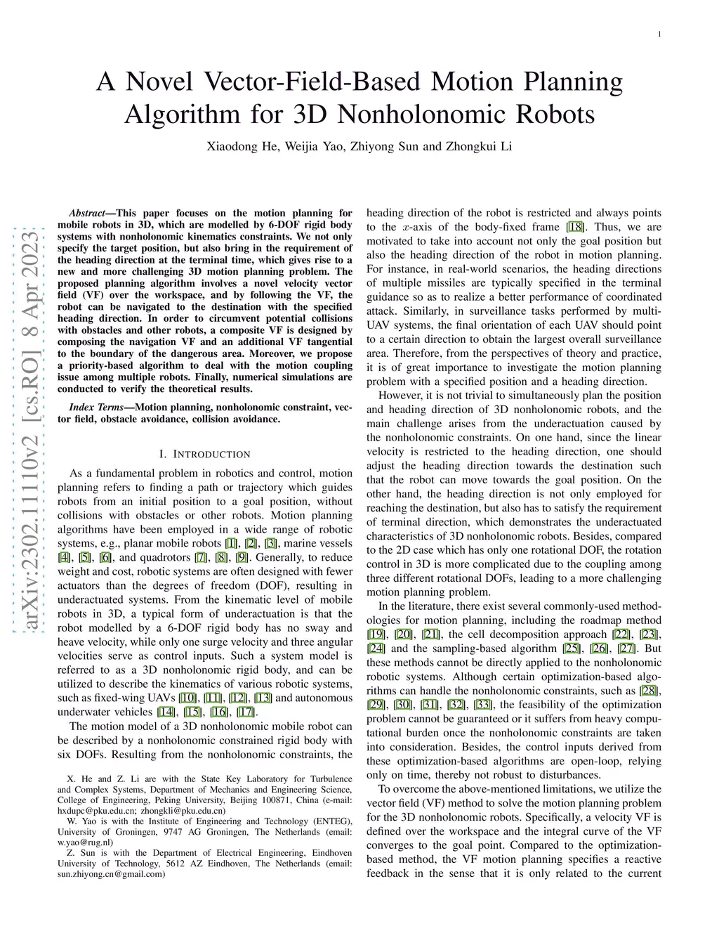A Novel Vector-Field-Based Motion Planning for 3D Nonholonomic Robots