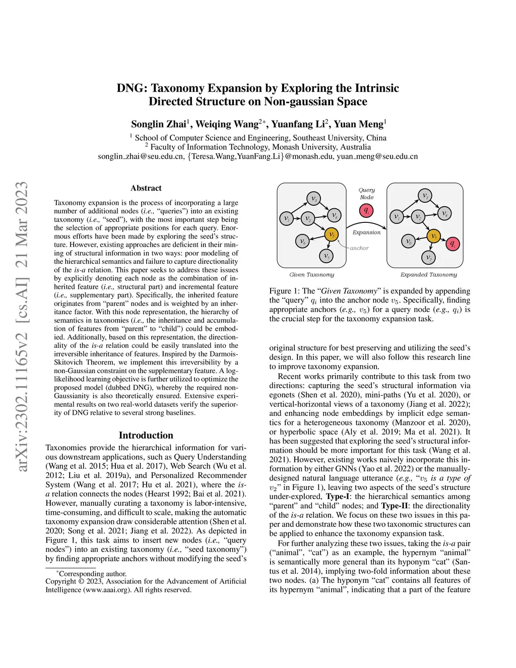 Taxonomy expansion is the process of incorporating a large number of additional nodes (i.e., "queries") into an existing taxonomy (i.e., "seed"), with the most important step being the selection of appropriate positions for each query. Enormous efforts have been made by exploring the seed's structure. However, existing approaches are deficient in their mining of structural information in two ways: poor modeling of the hierarchical semantics and failure to capture directionality of is-a relation. This paper seeks to address these issues by explicitly denoting each node as the combination of inherited feature (i.e., structural part) and incremental feature (i.e., supplementary part). Specifically, the inherited feature originates from "parent" nodes and is weighted by an inheritance factor. With this node representation, the hierarchy of semantics in taxonomies (i.e., the inheritance and accumulation of features from "parent" to "child") could be embodied. Additionally, based on this representation, the directionality of is-a relation could be easily translated into the irreversible inheritance of features. Inspired by the Darmois-Skitovich Theorem, we implement this irreversibility by a non-Gaussian constraint on the supplementary feature. A log-likelihood learning objective is further utilized to optimize the proposed model (dubbed DNG), whereby the required non-Gaussianity is also theoretically ensured. Extensive experimental results on two real-world datasets verify the superiority of DNG relative to several strong baselines.
