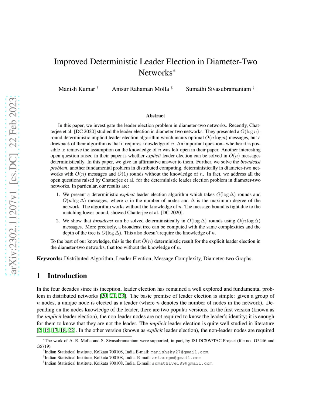 In this paper, we investigate the leader election problem in diameter-two networks. Recently, Chatterjee et al. [DC 2020] studied the leader election in diameter-two networks. They presented a -round deterministic {implicit} leader election algorithm which incurs optimal messages, but a drawback of their algorithm is that it requires knowledge of . An important question -- whether it is possible to remove the assumption on the knowledge of was left open in their paper. Another interesting open question raised in their paper is whether {\em explicit} leader election can be solved in messages deterministically. In this paper, we give an affirmative answer to them. Further, we solve the {\em broadcast problem}, another fundamental problem in distributed computing, deterministically in diameter-two networks with messages and rounds without the knowledge of . In fact, we address all the open questions raised by Chatterjee et al. for the deterministic leader election problem in diameter-two networks. To the best of our knowledge, this is the first deterministic result for the explicit leader election in the diameter-two networks, that too without the knowledge of .