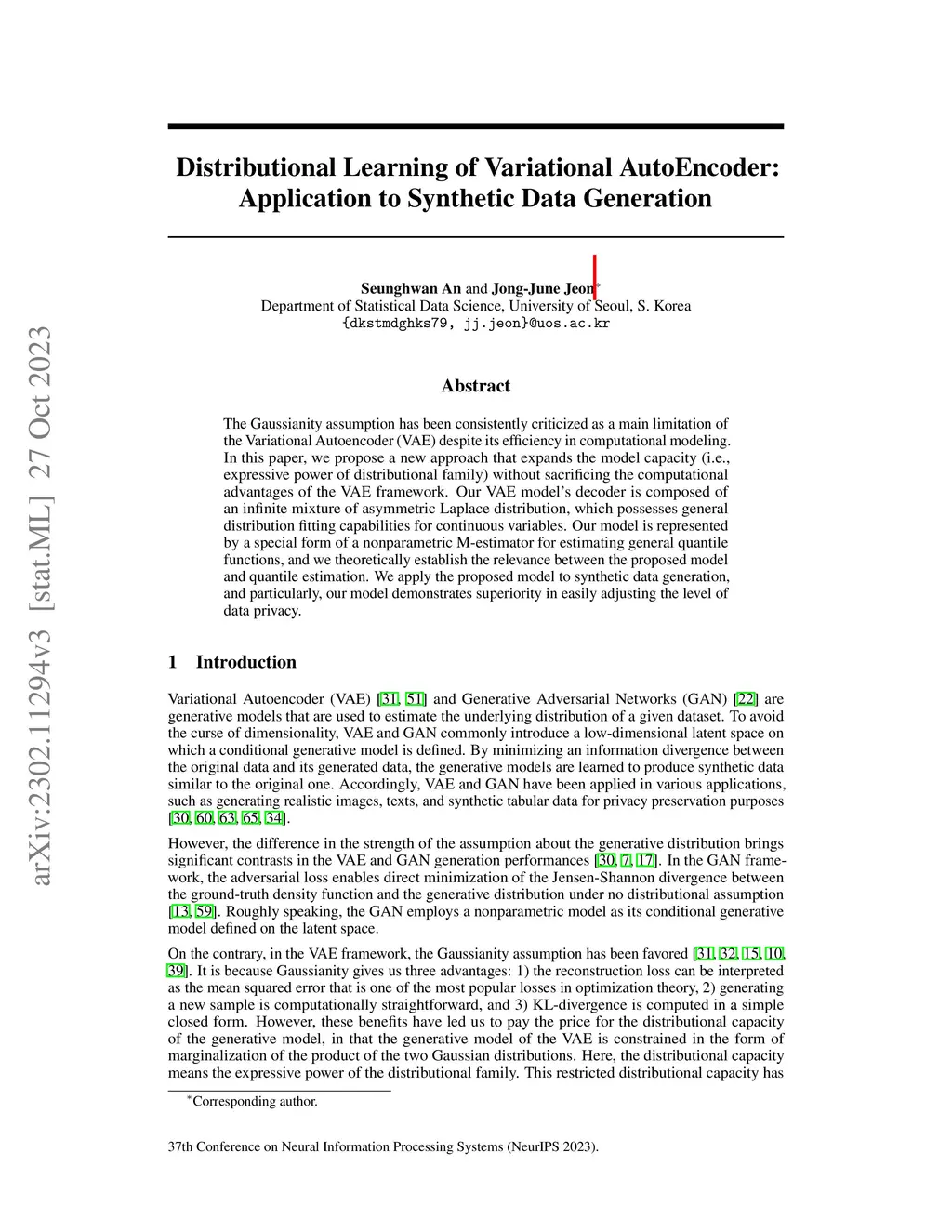 The Gaussianity assumption has been consistently criticized as a main limitation of the Variational Autoencoder (VAE) despite its efficiency in computational modeling. In this paper, we propose a new approach that expands the model capacity (i.e., expressive power of distributional family) without sacrificing the computational advantages of the VAE framework. Our VAE model's decoder is composed of an infinite mixture of asymmetric Laplace distribution, which possesses general distribution fitting capabilities for continuous variables. Our model is represented by a special form of a nonparametric M-estimator for estimating general quantile functions, and we theoretically establish the relevance between the proposed model and quantile estimation. We apply the proposed model to synthetic data generation, and particularly, our model demonstrates superiority in easily adjusting the level of data privacy.