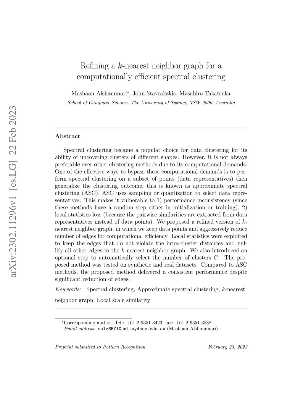 Spectral clustering became a popular choice for data clustering for its ability of uncovering clusters of different shapes. However, it is not always preferable over other clustering methods due to its computational demands. One of the effective ways to bypass these computational demands is to perform spectral clustering on a subset of points (data representatives) then generalize the clustering outcome, this is known as approximate spectral clustering (ASC). ASC uses sampling or quantization to select data representatives. This makes it vulnerable to 1) performance inconsistency (since these methods have a random step either in initialization or training), 2) local statistics loss (because the pairwise similarities are extracted from data representatives instead of data points). We proposed a refined version of -nearest neighbor graph, in which we keep data points and aggressively reduce number of edges for computational efficiency. Local statistics were exploited to keep the edges that do not violate the intra-cluster distances and nullify all other edges in the -nearest neighbor graph. We also introduced an optional step to automatically select the number of clusters . The proposed method was tested on synthetic and real datasets. Compared to ASC methods, the proposed method delivered a consistent performance despite significant reduction of edges.