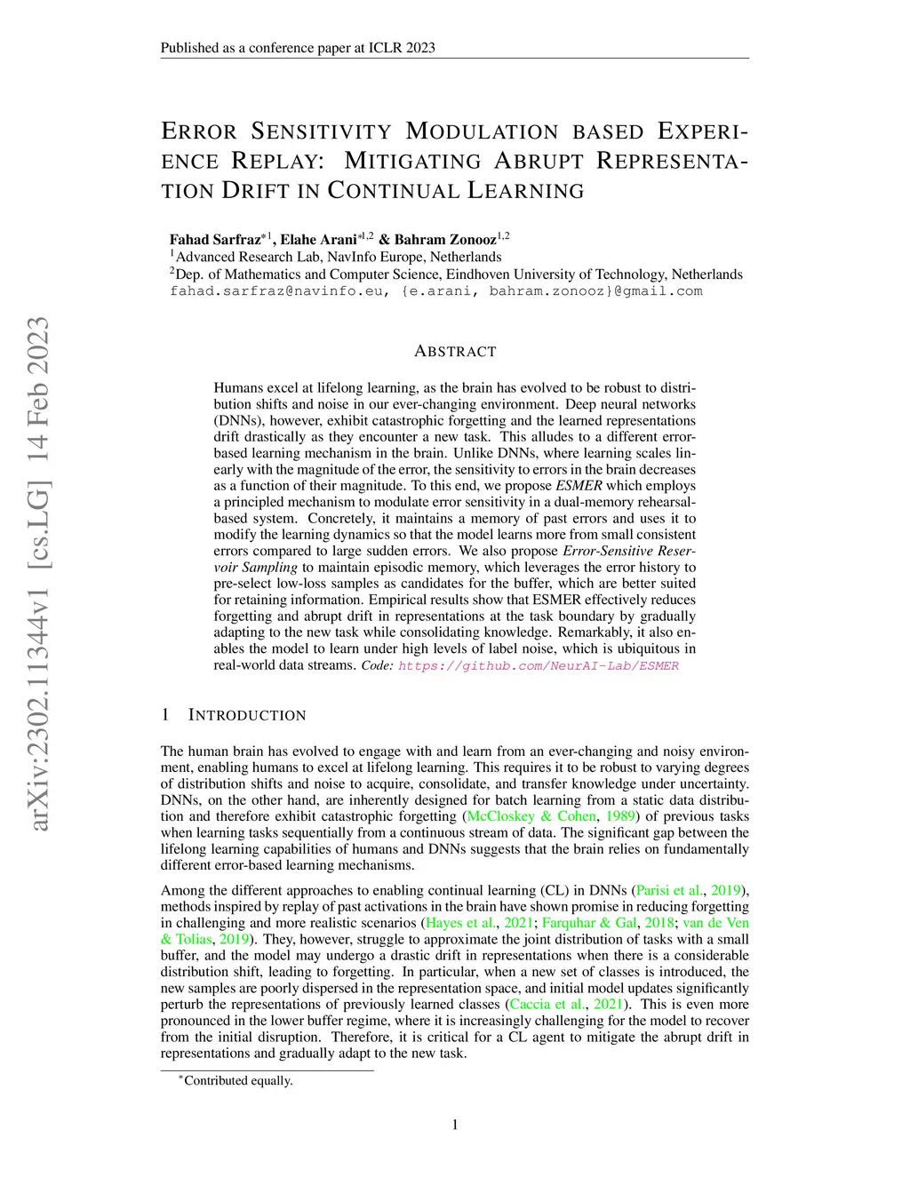 Humans excel at lifelong learning, as the brain has evolved to be robust to distribution shifts and noise in our ever-changing environment. Deep neural networks (DNNs), however, exhibit catastrophic forgetting and the learned representations drift drastically as they encounter a new task. This alludes to a different error-based learning mechanism in the brain. Unlike DNNs, where learning scales linearly with the magnitude of the error, the sensitivity to errors in the brain decreases as a function of their magnitude. To this end, we propose \textit{ESMER} which employs a principled mechanism to modulate error sensitivity in a dual-memory rehearsal-based system. Concretely, it maintains a memory of past errors and uses it to modify the learning dynamics so that the model learns more from small consistent errors compared to large sudden errors. We also propose \textit{Error-Sensitive Reservoir Sampling} to maintain episodic memory, which leverages the error history to pre-select low-loss samples as candidates for the buffer, which are better suited for retaining information. Empirical results show that ESMER effectively reduces forgetting and abrupt drift in representations at the task boundary by gradually adapting to the new task while consolidating knowledge. Remarkably, it also enables the model to learn under high levels of label noise, which is ubiquitous in real-world data streams.