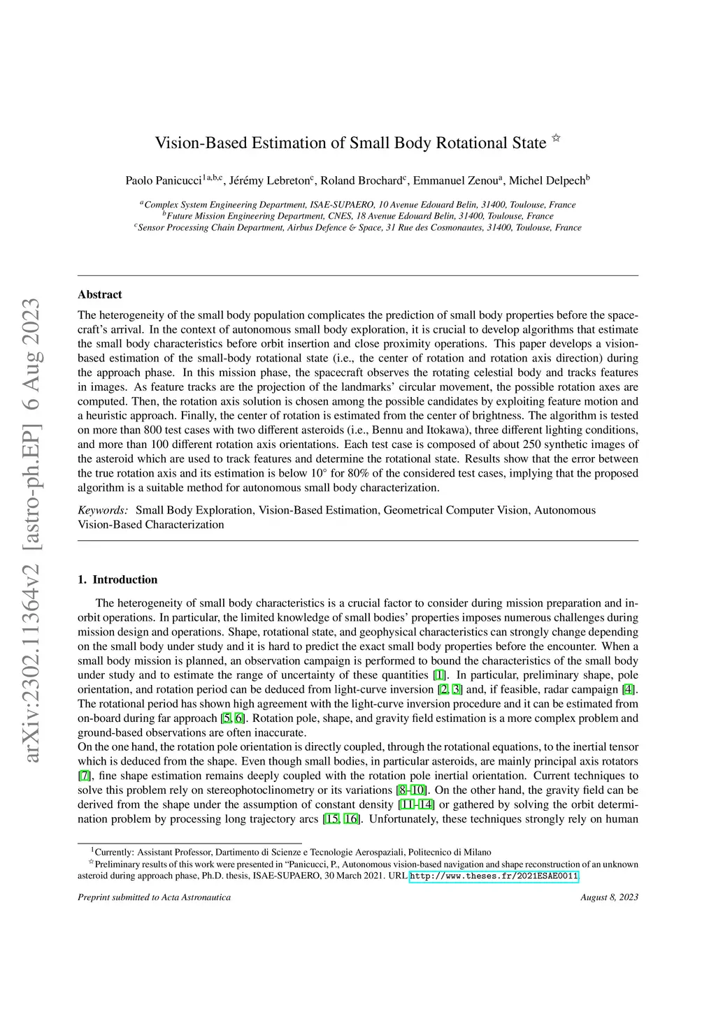 The heterogeneity of the small body population complicates the prediction of small body properties before the spacecraft's arrival. In the context of autonomous small body exploration, it is crucial to develop algorithms that estimate the small body characteristics before orbit insertion and close proximity operations. This paper develops a vision-based estimation of the small-body rotational state (i.e., the center of rotation and rotation axis direction) during the approach phase. In this mission phase, the spacecraft observes the rotating celestial body and tracks features in images. As feature tracks are the projection of the landmarks' circular movement, the possible rotation axes are computed. Then, the rotation axis solution is chosen among the possible candidates by exploiting feature motion and a heuristic approach. Finally, the center of rotation is estimated from the center of brightness. The algorithm is tested on more than 800 test cases with two different asteroids (i.e., Bennu and Itokawa), three different lighting conditions, and more than 100 different rotation axis orientations. Each test case is composed of about 250 synthetic images of the asteroid which are used to track features and determine the rotational state. Results show that the error between the true rotation axis and its estimation is below for of the considered test cases, implying that the proposed algorithm is a suitable method for autonomous small body characterization.