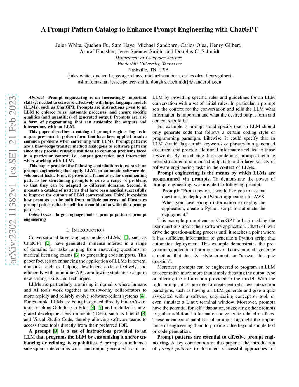 Prompt engineering is an increasingly important skill set needed to converse effectively with large language models (LLMs), such as ChatGPT. Prompts are instructions given to an LLM to enforce rules, automate processes, and ensure specific qualities (and quantities) of generated output. Prompts are also a form of programming that can customize the outputs and interactions with an LLM. This paper describes a catalog of prompt engineering techniques presented in pattern form that have been applied to solve common problems when conversing with LLMs. Prompt patterns are a knowledge transfer method analogous to software patterns since they provide reusable solutions to common problems faced in a particular context, i.e., output generation and interaction when working with LLMs. This paper provides the following contributions to research on prompt engineering that apply LLMs to automate software development tasks. First, it provides a framework for documenting patterns for structuring prompts to solve a range of problems so that they can be adapted to different domains. Second, it presents a catalog of patterns that have been applied successfully to improve the outputs of LLM conversations. Third, it explains how prompts can be built from multiple patterns and illustrates prompt patterns that benefit from combination with other prompt patterns.