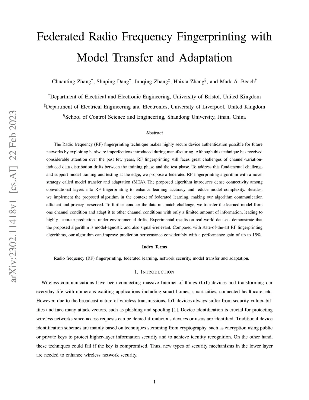 The Radio frequency (RF) fingerprinting technique makes highly secure device authentication possible for future networks by exploiting hardware imperfections introduced during manufacturing. Although this technique has received considerable attention over the past few years, RF fingerprinting still faces great challenges of channel-variation-induced data distribution drifts between the training phase and the test phase. To address this fundamental challenge and support model training and testing at the edge, we propose a federated RF fingerprinting algorithm with a novel strategy called model transfer and adaptation (MTA). The proposed algorithm introduces dense connectivity among convolutional layers into RF fingerprinting to enhance learning accuracy and reduce model complexity. Besides, we implement the proposed algorithm in the context of federated learning, making our algorithm communication efficient and privacy-preserved. To further conquer the data mismatch challenge, we transfer the learned model from one channel condition and adapt it to other channel conditions with only a limited amount of information, leading to highly accurate predictions under environmental drifts. Experimental results on real-world datasets demonstrate that the proposed algorithm is model-agnostic and also signal-irrelevant. Compared with state-of-the-art RF fingerprinting algorithms, our algorithm can improve prediction performance considerably with a performance gain of up to 15\%.