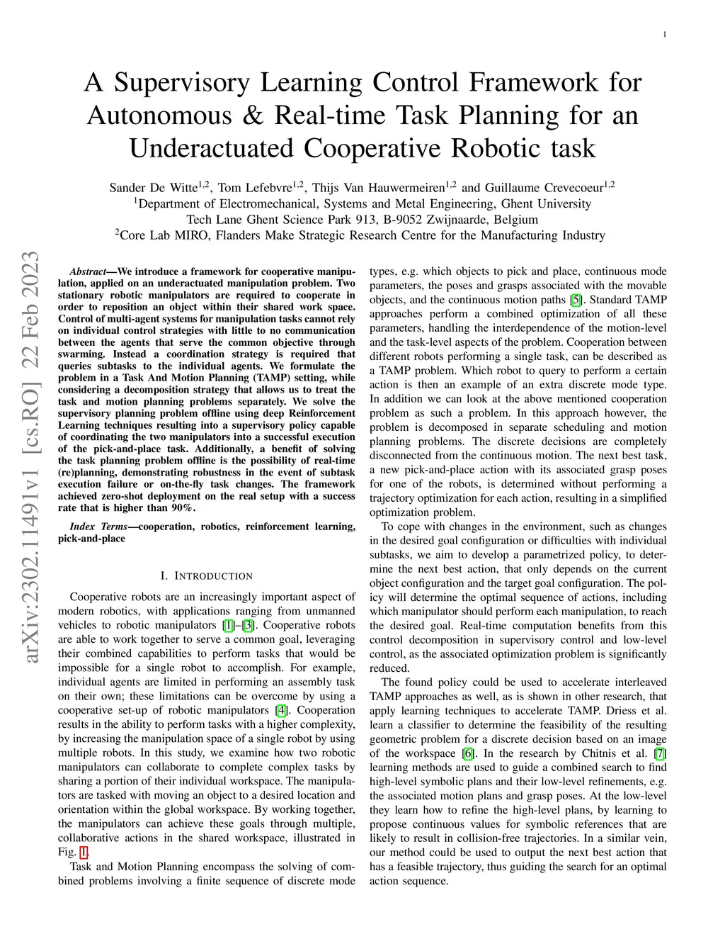 We introduce a framework for cooperative manipulation, applied on an underactuated manipulation problem. Two stationary robotic manipulators are required to cooperate in order to reposition an object within their shared work space. Control of multi-agent systems for manipulation tasks cannot rely on individual control strategies with little to no communication between the agents that serve the common objective through swarming. Instead a coordination strategy is required that queries subtasks to the individual agents. We formulate the problem in a Task And Motion Planning (TAMP) setting, while considering a decomposition strategy that allows us to treat the task and motion planning problems separately. We solve the supervisory planning problem offline using deep Reinforcement Learning techniques resulting into a supervisory policy capable of coordinating the two manipulators into a successful execution of the pick-and-place task. Additionally, a benefit of solving the task planning problem offline is the possibility of real-time (re)planning, demonstrating robustness in the event of subtask execution failure or on-the-fly task changes. The framework achieved zero-shot deployment on the real setup with a success rate that is higher than 90%.