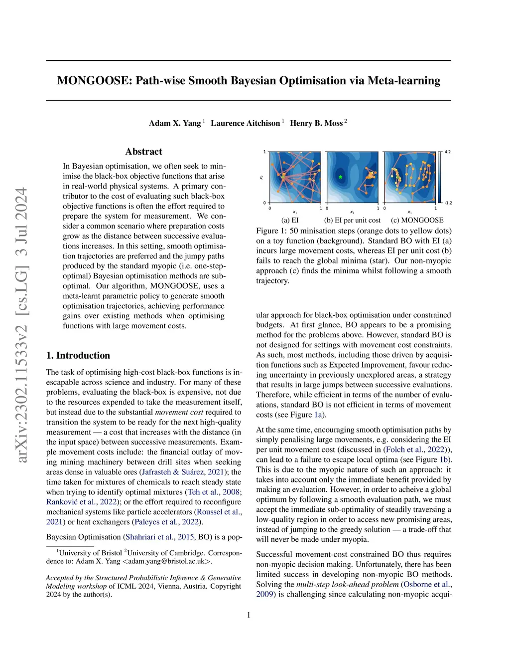 In Bayesian optimisation, we often seek to minimise the black-box objective functions that arise in real-world physical systems. A primary contributor to the cost of evaluating such black-box objective functions is often the effort required to prepare the system for measurement. We consider a common scenario where preparation costs grow as the distance between successive evaluations increases. In this setting, smooth optimisation trajectories are preferred and the jumpy paths produced by the standard myopic (i.e.\ one-step-optimal) Bayesian optimisation methods are sub-optimal. Our algorithm, MONGOOSE, uses a meta-learnt parametric policy to generate smooth optimisation trajectories, achieving performance gains over existing methods when optimising functions with large movement costs.