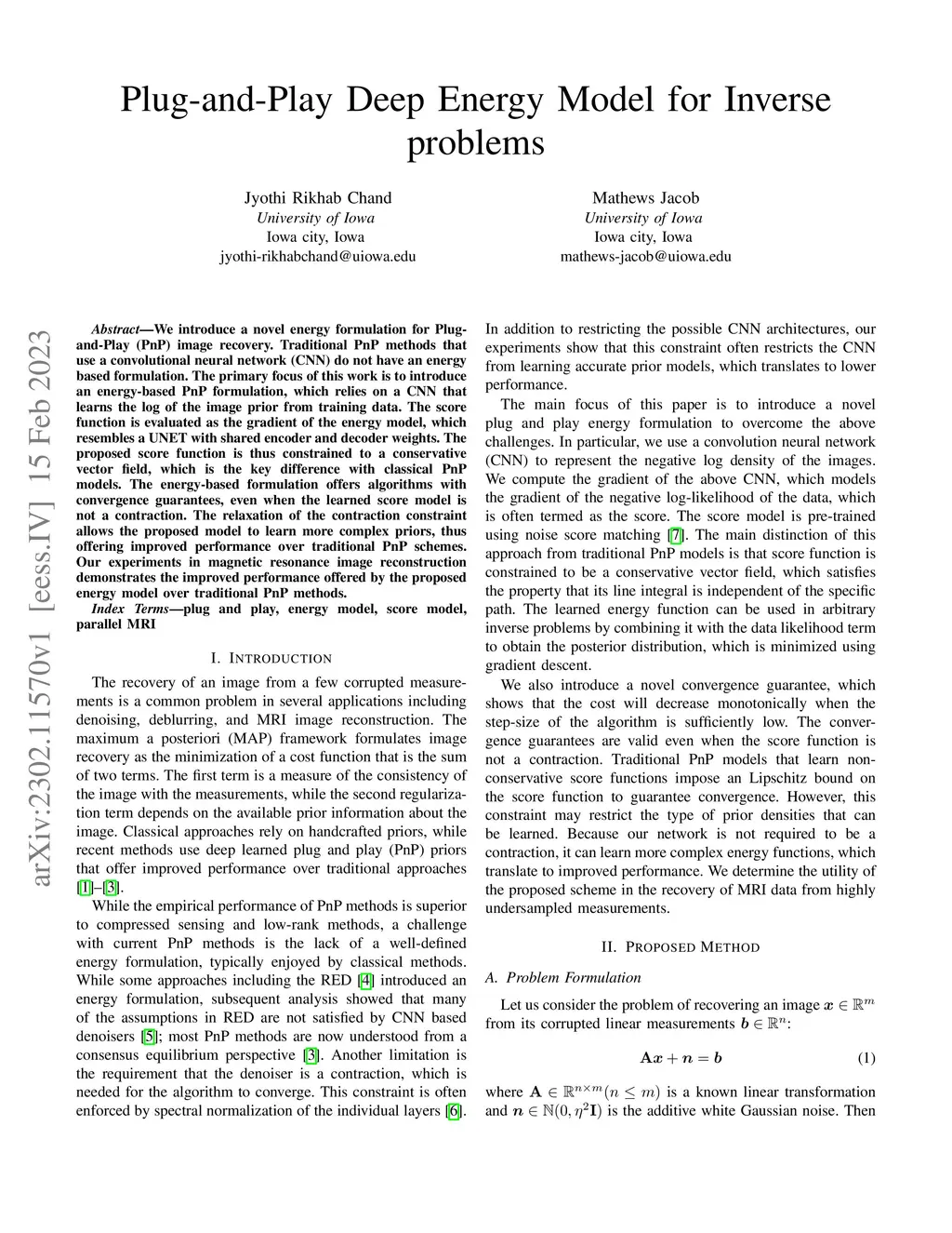 We introduce a novel energy formulation for Plug- and-Play (PnP) image recovery. Traditional PnP methods that use a convolutional neural network (CNN) do not have an energy based formulation. The primary focus of this work is to introduce an energy-based PnP formulation, which relies on a CNN that learns the log of the image prior from training data. The score function is evaluated as the gradient of the energy model, which resembles a UNET with shared encoder and decoder weights. The proposed score function is thus constrained to a conservative vector field, which is the key difference with classical PnP models. The energy-based formulation offers algorithms with convergence guarantees, even when the learned score model is not a contraction. The relaxation of the contraction constraint allows the proposed model to learn more complex priors, thus offering improved performance over traditional PnP schemes. Our experiments in magnetic resonance image reconstruction demonstrates the improved performance offered by the proposed energy model over traditional PnP methods.