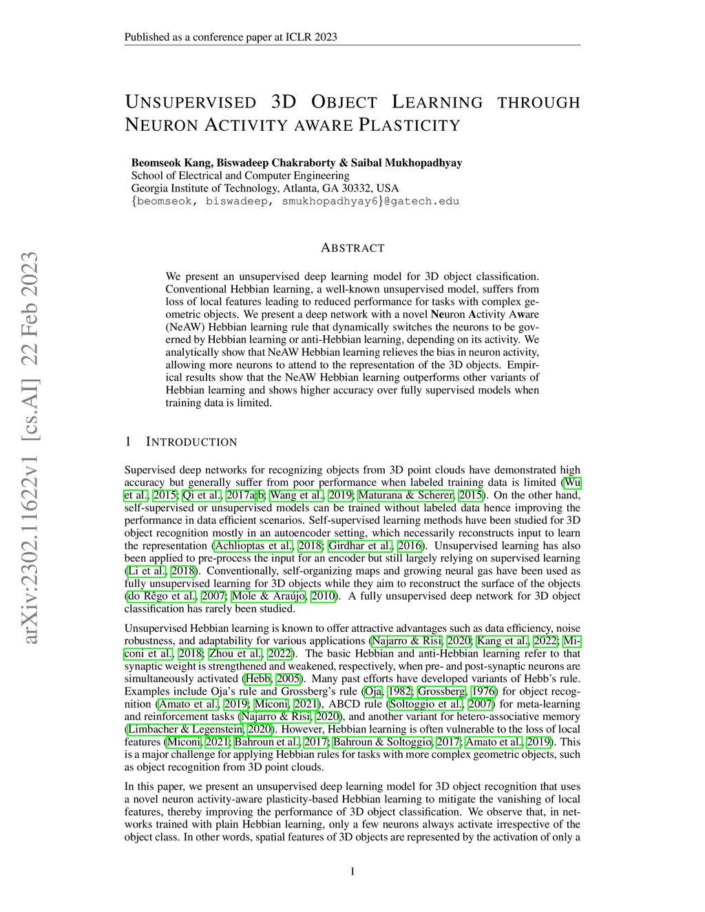 Unsupervised 3D Object Learning through Neuron Activity aware Plasticity